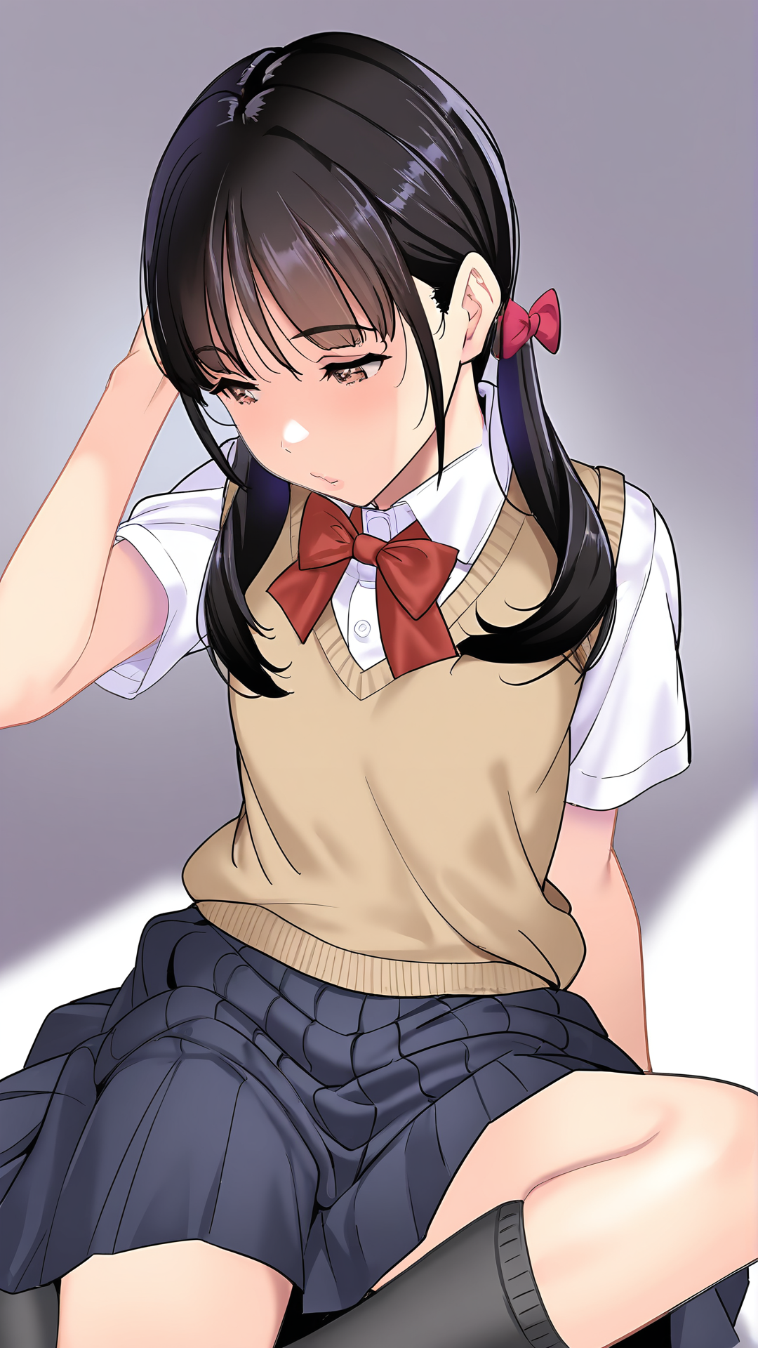 AniImoutoSuimin,1girl,school uniform,solo,socks,twintails,skirt,sweater vest,black hair,black socks,bow,pleated skirt,brown eyes,shirt,bowtie,short sleeves,red bow,