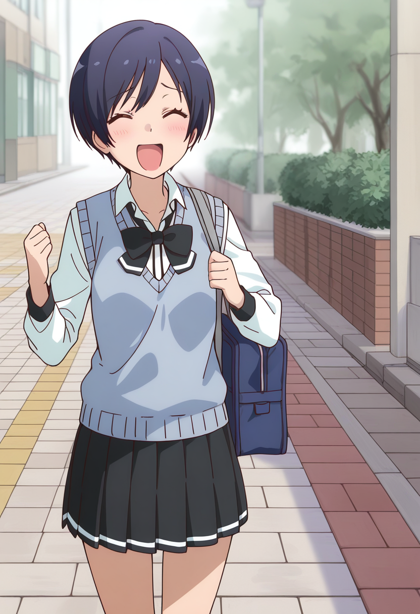 ・sweater vest, dress shirt, black bowtie, long sleeves, black skirt, pleated skirt, black socks, uwabaki