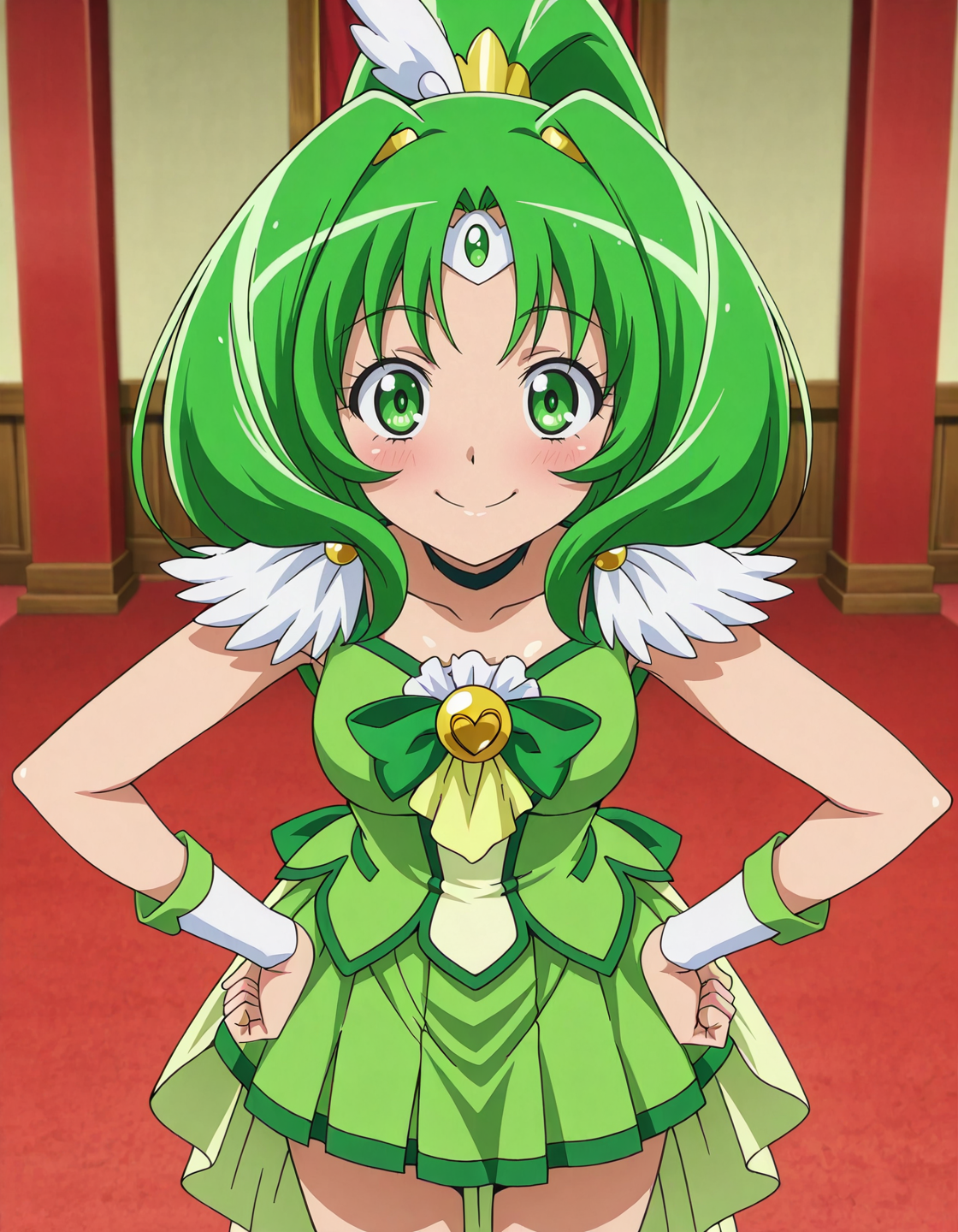 anime screencap, solo,1girl,curemarch,marchcostume,green skirt,<lora:curemarch_IL:0.8> high definition,amazing quality,best quality,very aesthetic,masterpiece,absurdres,