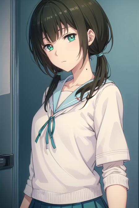 chizuru hishiro, long hair, black hair, twintails, (green eyes:1.3), mole, low twintails