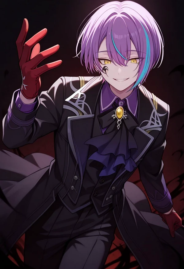 1boy, male focus, solo, yellow eyes, multicolored hair, streaked hair, hair between eyes, purple hair, blue hair, facial mark, ascot, black ascot, shirt, purple shirt, collared shirt, vest, black vest, jacket, black jacket, black coat, long sleeves, gloves, red gloves, pants, black pants, boots, black footwear,
