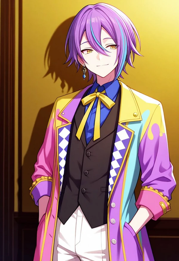 1boy, male focus, solo, yellow eyes, multicolored hair, streaked hair, hair between eyes, purple hair, blue hair, jewelry, earrings, neck ribbon, yellow neck ribbon, shirt, collared shirt, blue shirt, vest, black vest, coat, multicolored coat, multicolored clothes, blue coat, pink coat, yellow coat, pants, white pants, boots, black footwear, gloves, white gloves, half gloves,