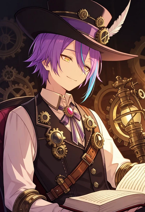 1boy, male focus, solo, yellow eyes, multicolored hair, streaked hair, hair between eyes, purple hair, blue hair, hat, black headwear, shirt, white shirt, collared shirt, vest, black vest, frills, frilled sleeves, long sleeves, pants, black pants, jewelry, brooch, gears, steampunk,