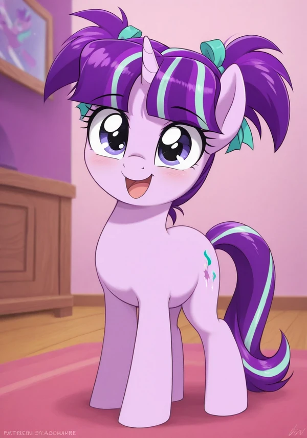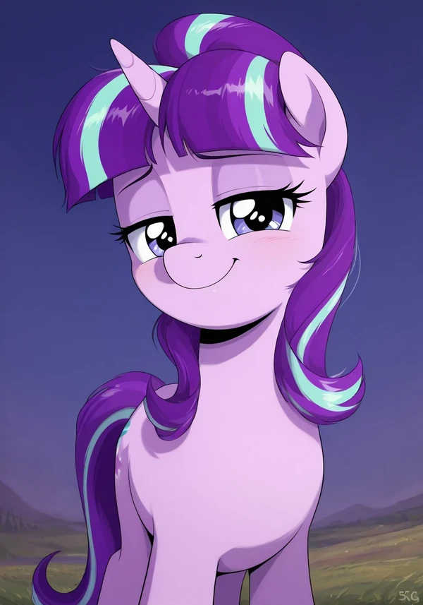 Normal Glimmy: starlight glimmer, pony, unicorn, indigo eyes, purple hair with aquamarine streaks(and you might also want to put blunt bangs, s5sg in the negative prompt)
