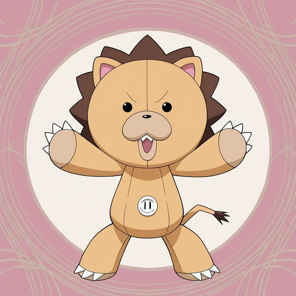 Tags to use: male, no sclera, dot eyes, black eyes, yellow body, Lion, brown mane, animal ears, pink inner ears, tail, stuffed animal, plush body, claws, toe claws, black nose, white button