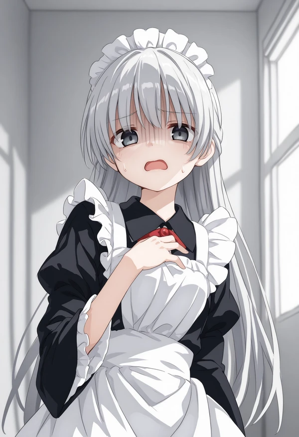The trigger word alone is only an expression or a pose, but many illustrations often show a cartoon-like dark shadow falling on the face, empty eyes with no pupils, and unconsciously defensive hand movements, so hands up, sweatdrop, looking at viewer, shaded face, turn pale, jitome, jitters, and so on. face, turn pale, jitome, disgust, gloom (expression), d:, frown, empty eyes, no pupils. You can also add other effects such as mouth opening, teeth clenching, etc., depending on the desired reaction.
