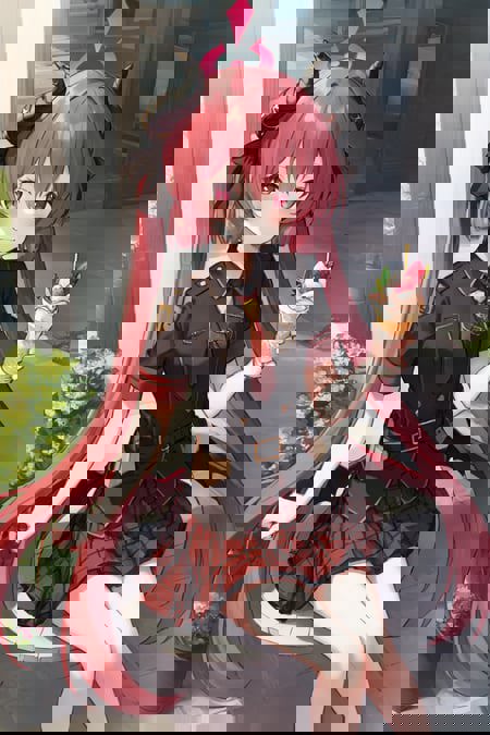 For her normal outfit: military uniform, black shirt, plaid skirt, red necktie, thigh strap, black boots