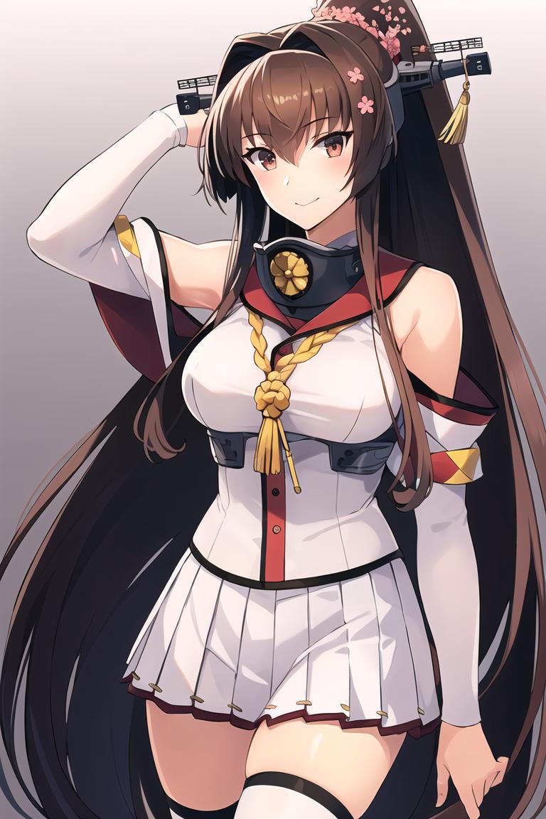 yamato_\(kancolle\) 1girl brown_eyes brown_hair large_breasts long_hair hair_ornament ponytail cherry_blossoms hair_flower