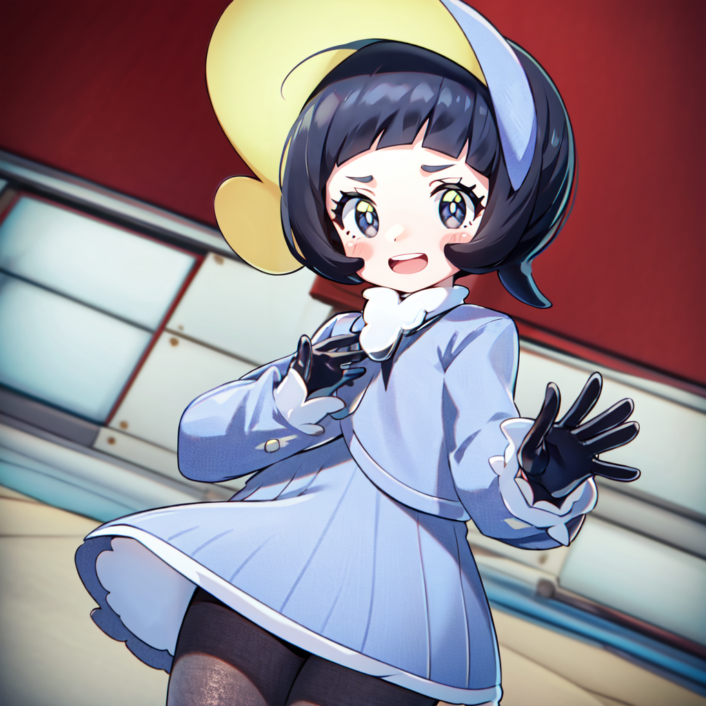 1girl solo gloves blush_stickers pantyhose black_hair dress short_hair smile eyelashes cardigan black_gloves bangs grey_dress grey_footwear black_eyes bonnet blunt_bangs grey_cardigan open_cardigan long_sleeves jewelry necklace puppy_pokemon