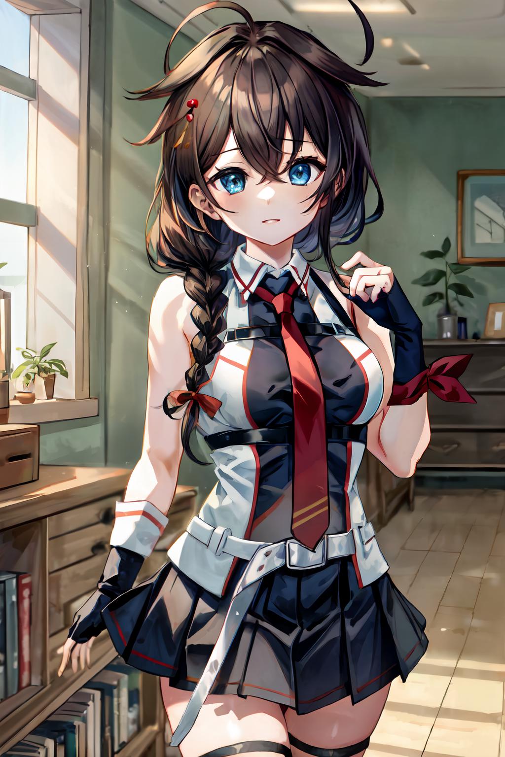 https://civitai.com/models/106378/shigure-kai-san-kancolle OPTIONAL:: hair over shoulder, hair ornament, hair between eyes, blue eyes OPTIONAL:: ShigureKaiSanCasualKC, (long sleeves), hat, (white) beret, (white) shirt, (white) dress, (black) jacket, (red) necktie *Remove ShigureKaiSanKC*