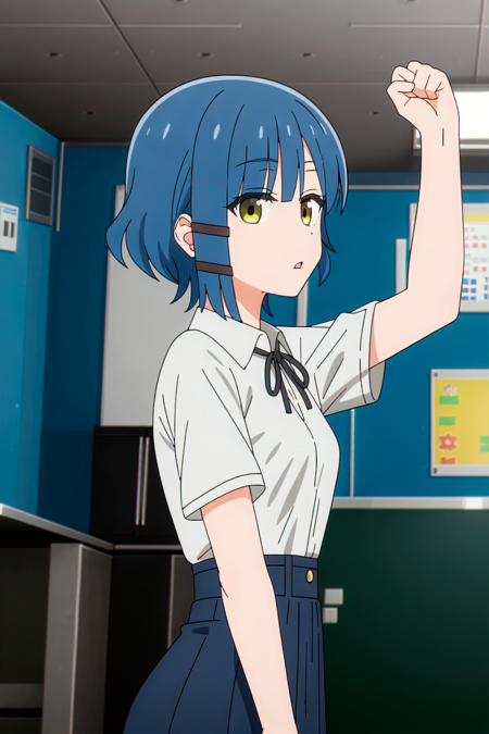 1girl, solo, high_quality, 8k, masterpiece, defined_pupil, vivid_colors, (high_quality_eyes:1.1), (classroom_background:1.2), bookshelf, looking_at_viewer, (from_side:1.2), (hand_up:1.2), blushed, serious, closed_mouth, (white_collared_shirt:1.3), (blue_skirt:1.2), (black_neck_ribbon:1.2), thighs, defined_ass, (medium_breasts:1.3), perfect_breasts, sexy_body, hairclip, mole, mole_under_eye, short_hair, bangs, blue_hair,