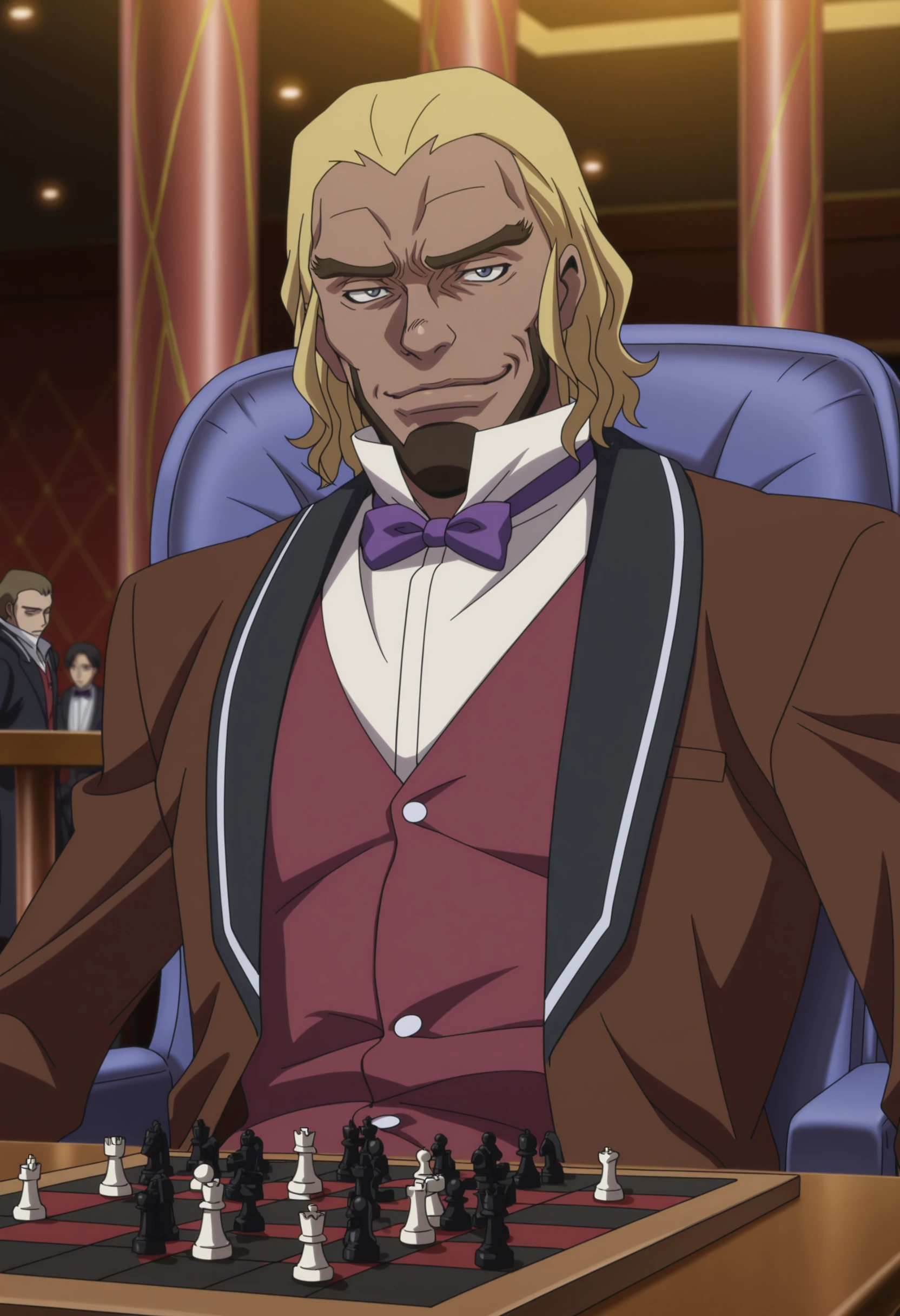 Black King: CGBKing, dark-skinned male, dark skin, suit, brown jacket, red vest, buttons, purple bowtie, white collared shirt, popped collar, black pants, black shoes