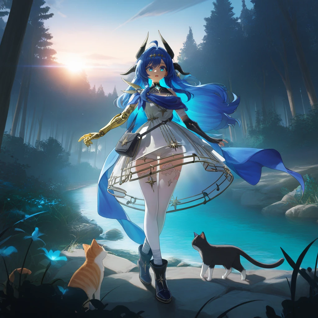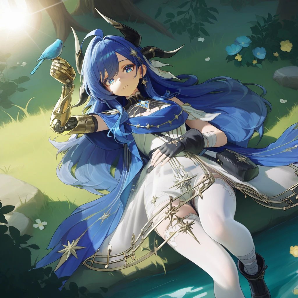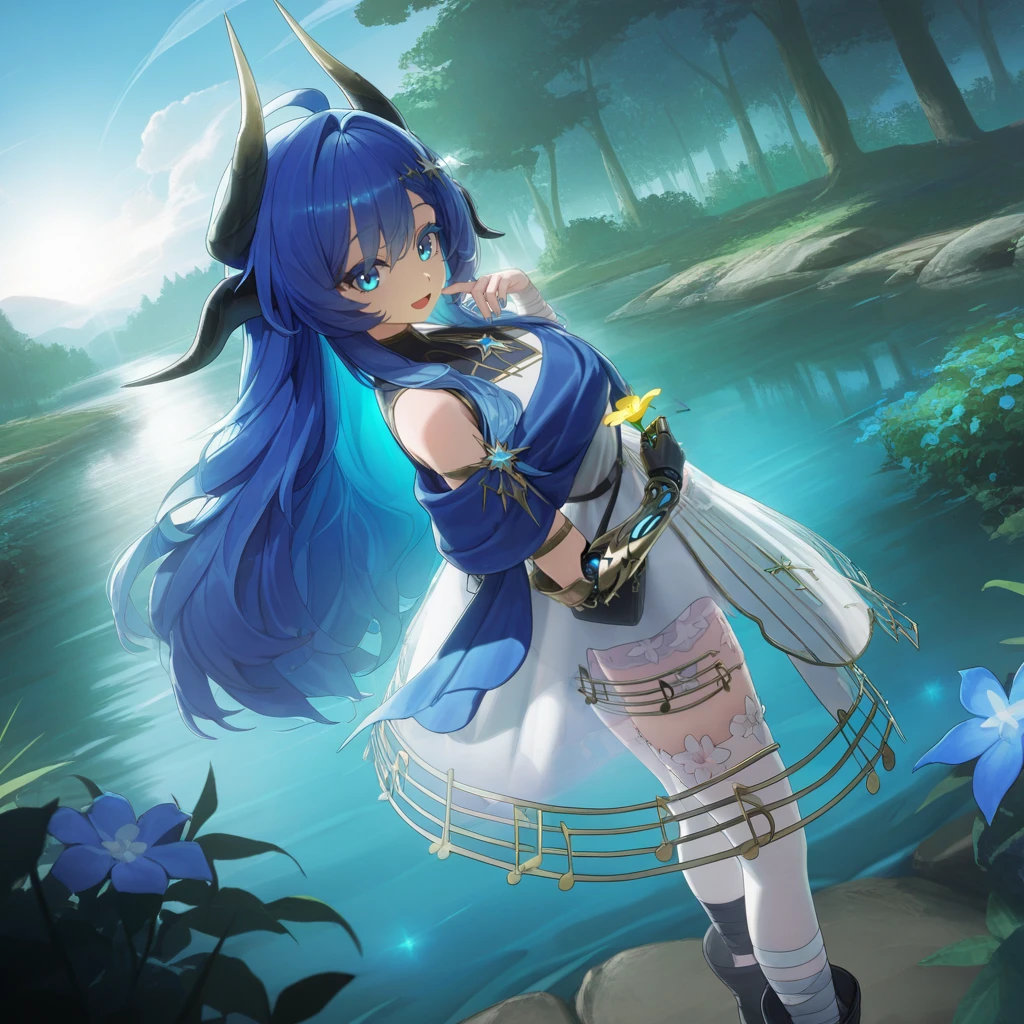 BardDNA, blue eyes, blue hair, long hair, ahoge, sidelocks, white dress, sleeveless dress, black gorget, gorget, star (symbol), colored eyelashes, hair ornament, horns, waist bag, black bag, multiple horns, gold trim, blue shawl, shawl, see-through, bare shoulders, single mechanical arm, gold prosthesis, prosthetic arm, single glove, black gloves, fingerless gloves, bandaged arm, gold feather, blue gemstone, clothing cutout, see-through skirt, musical note, musical note print, white thighhighs, thighhighs, shorts under dress, white shorts, flower-trimmed thighhighs, uneven footwear, bandaged ankle, ankle boots, black footwear, boots,Note: Can we just talk about the fact that if you actually looked at her design and all of the details you would realise that she has the most detailed model in the entire game ? And I'm being completely serious here.