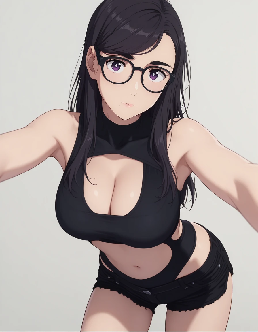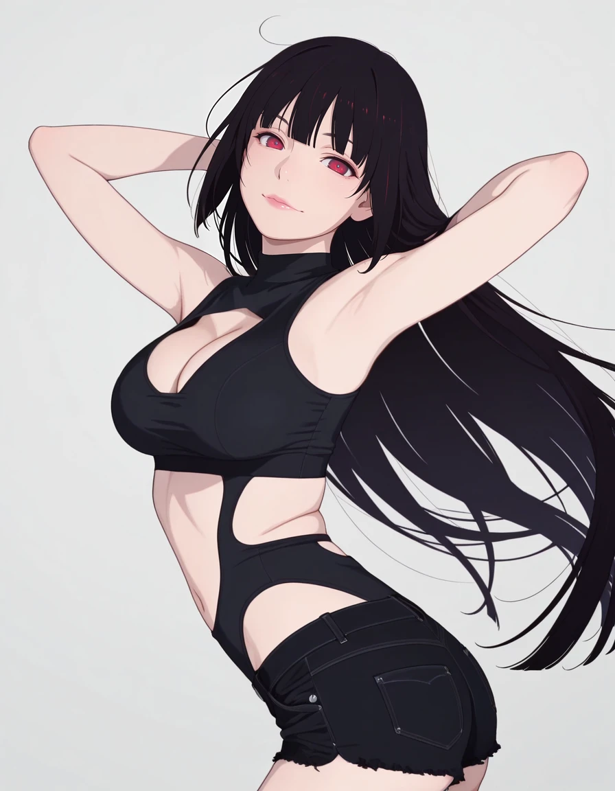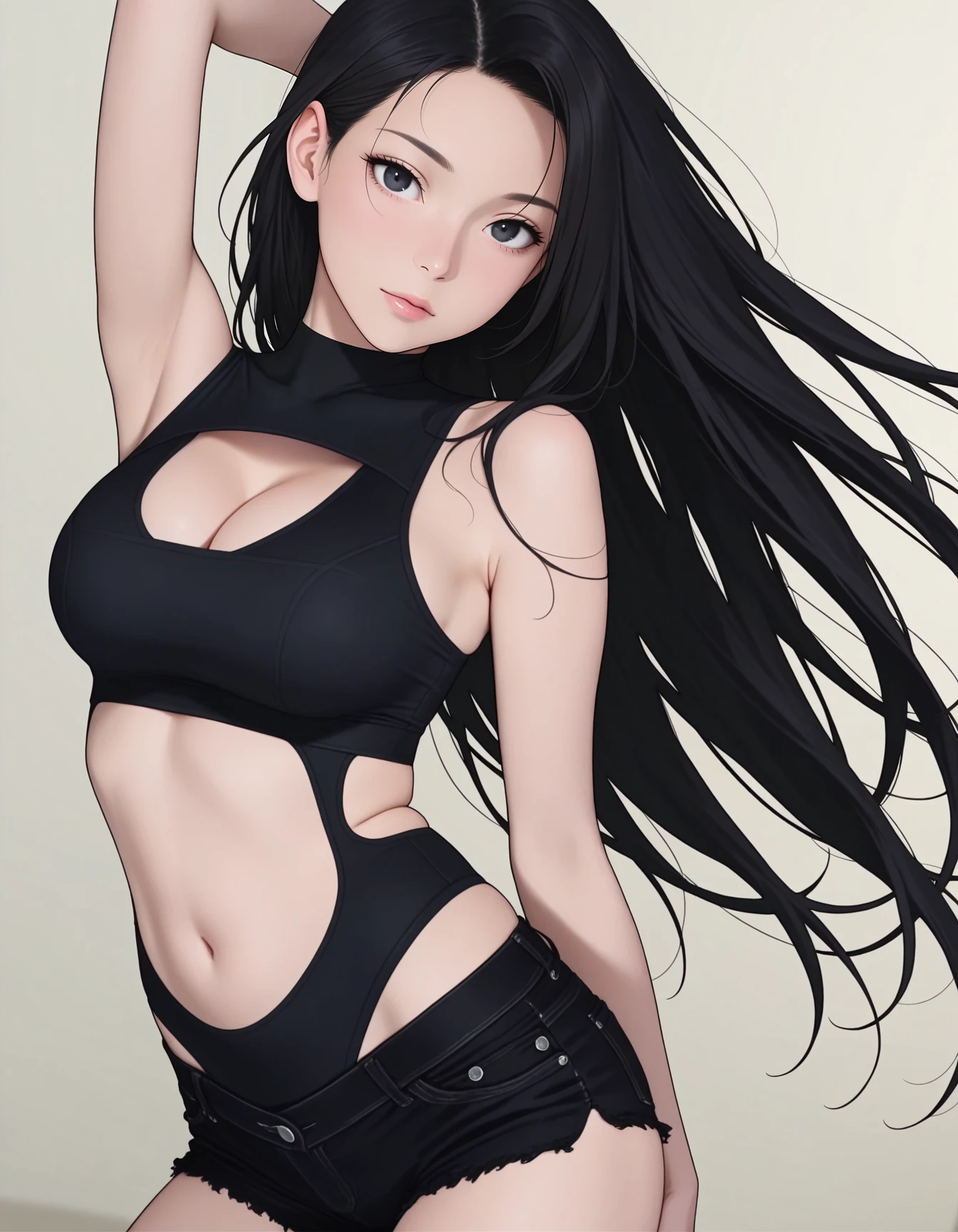 mai_bj_clothing_sexy_black_3, midriff, clothing_cutout, cleavage_cutout, stomach_cutout, black_shorts