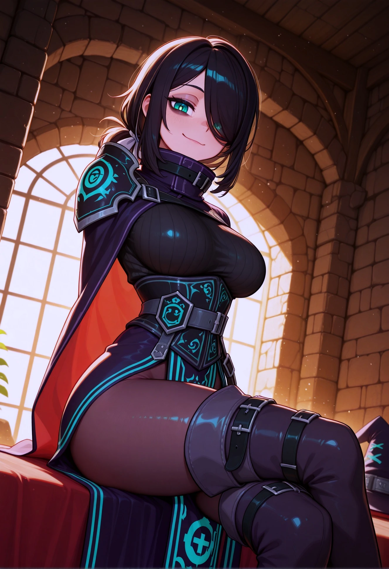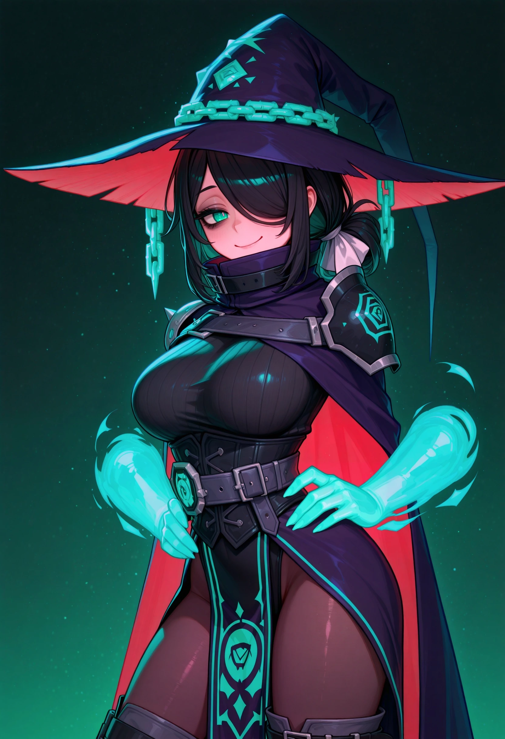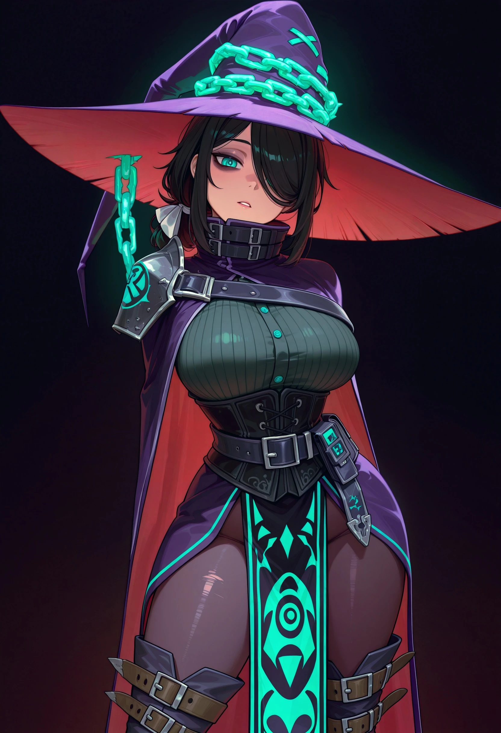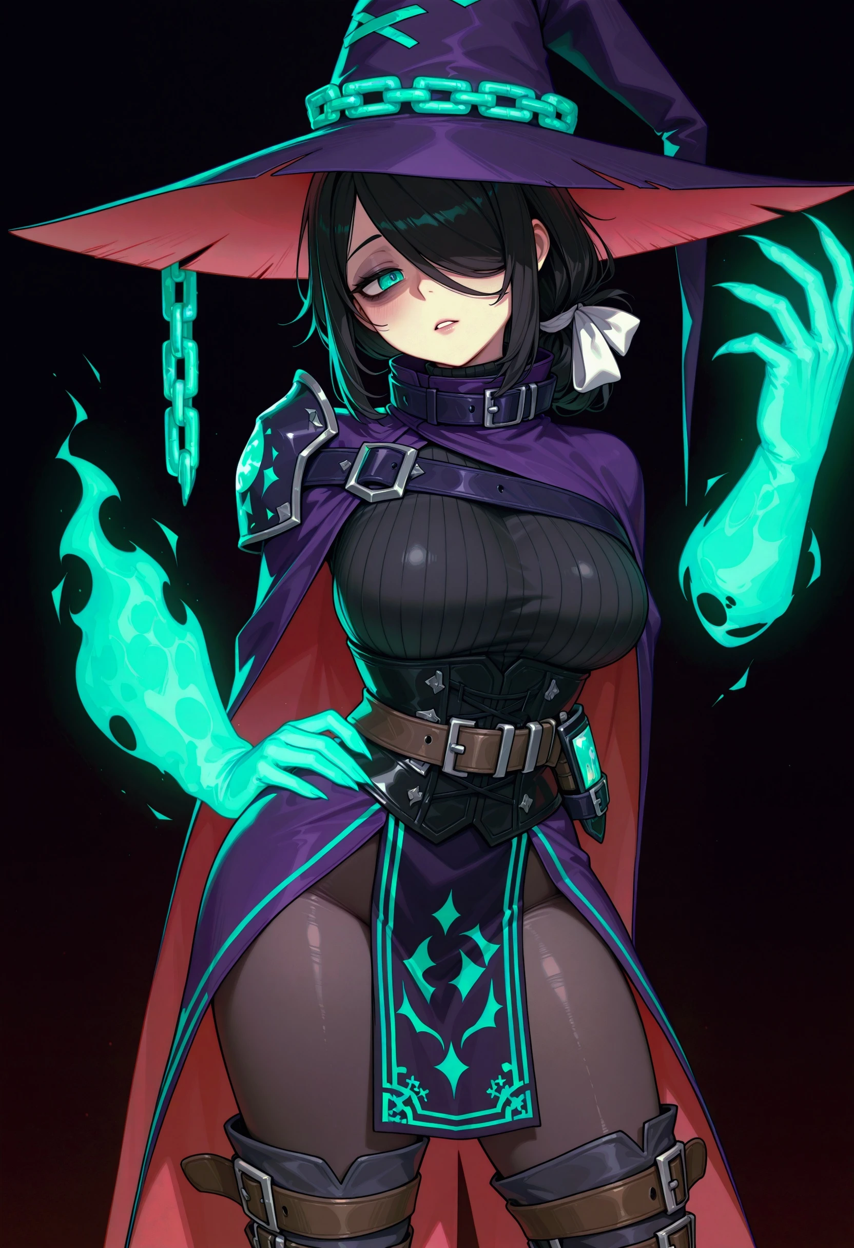 witch hat, hat chain, armless amputee, double amputee, detached arms, ghost hands, large breasts, black sweater, cloak, high collar, belt collar, single shoulder pad, grey shoulder pad, shoulder belt, black corset, high belt, purple showgirl skirt, pelvic curtain, pantyhose, thigh boots, damaged boots, boot beltsCasual Look