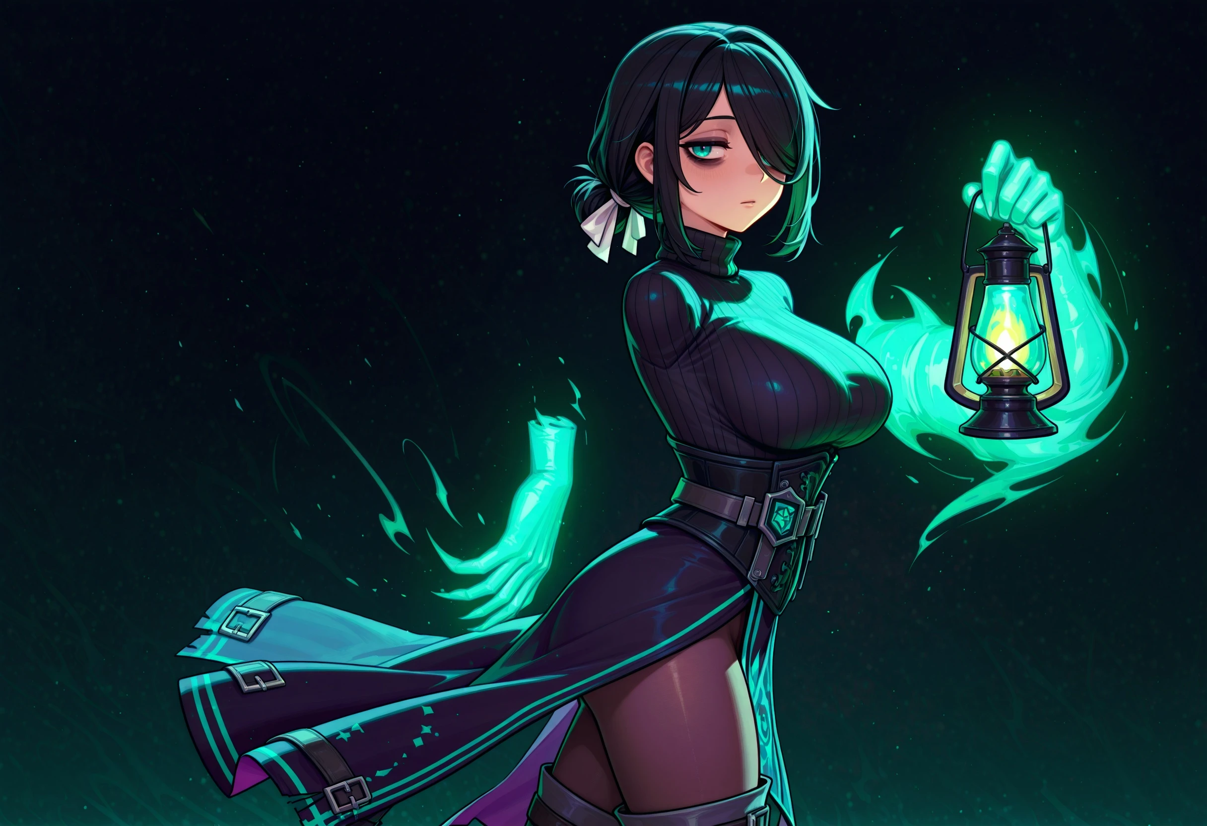 armless amputee, double amputee, detached arms, ghost hands, large breasts, black turtleneck sweater, chest harness, o-ring harness, high belt, black corset, pelvic curtain, purple showgirl skirt, pantyhose, thigh boots, damaged boots, boot belts,Note: Most base checkpoints seem to have a bit of trouble "understanding" that she's not supposed to have arms, even with the double amputee and detached arms tags.