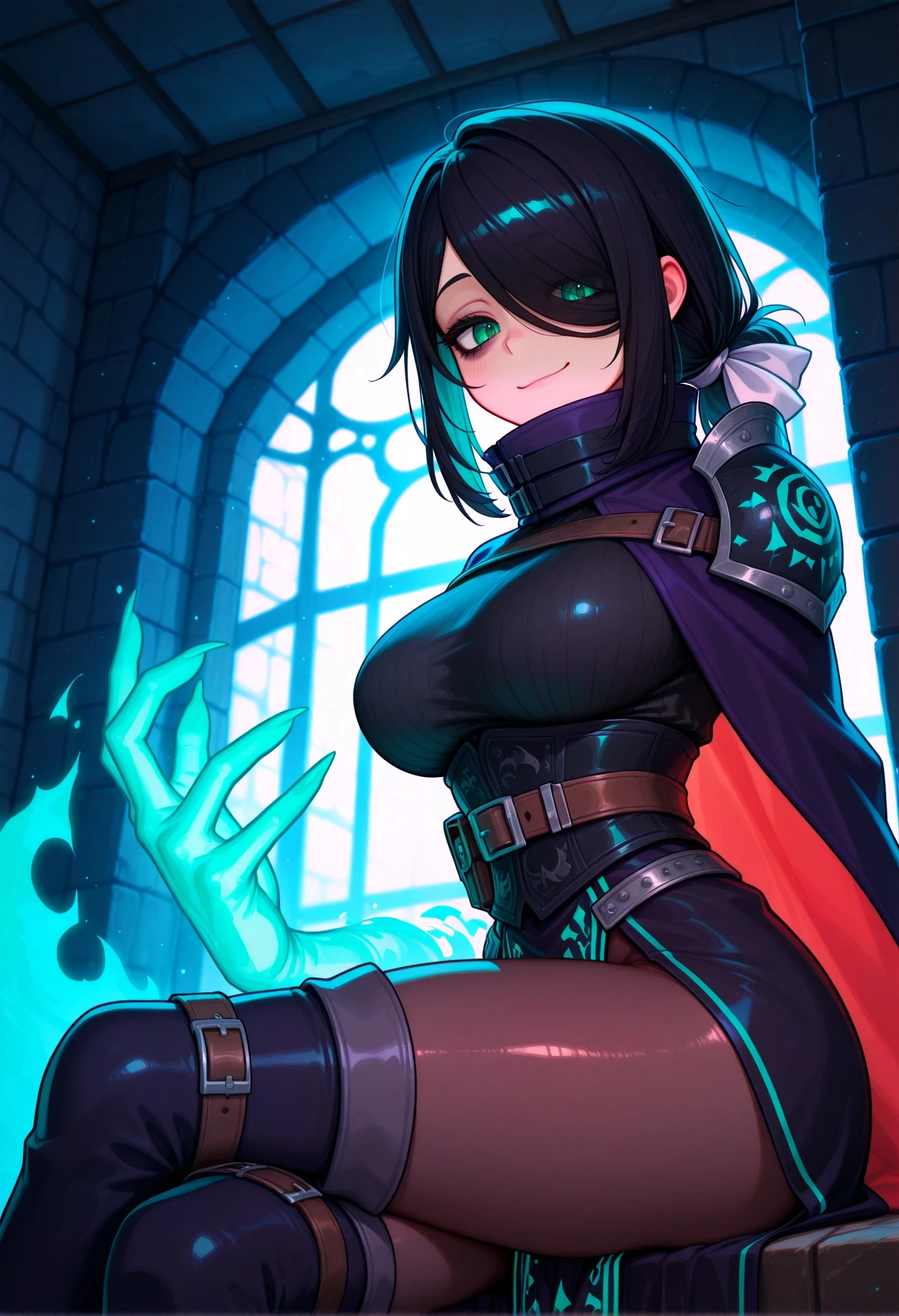 black hair, hair over one eye, low side ponytail, hair ribbon, green eyes, bags under eyes,