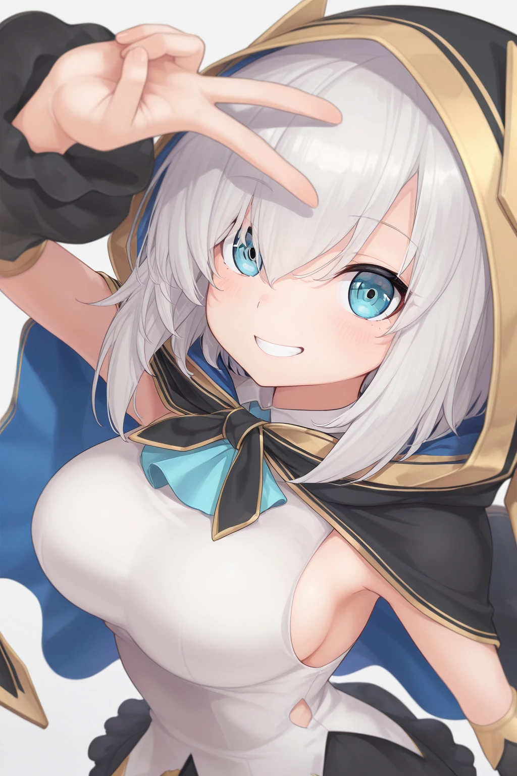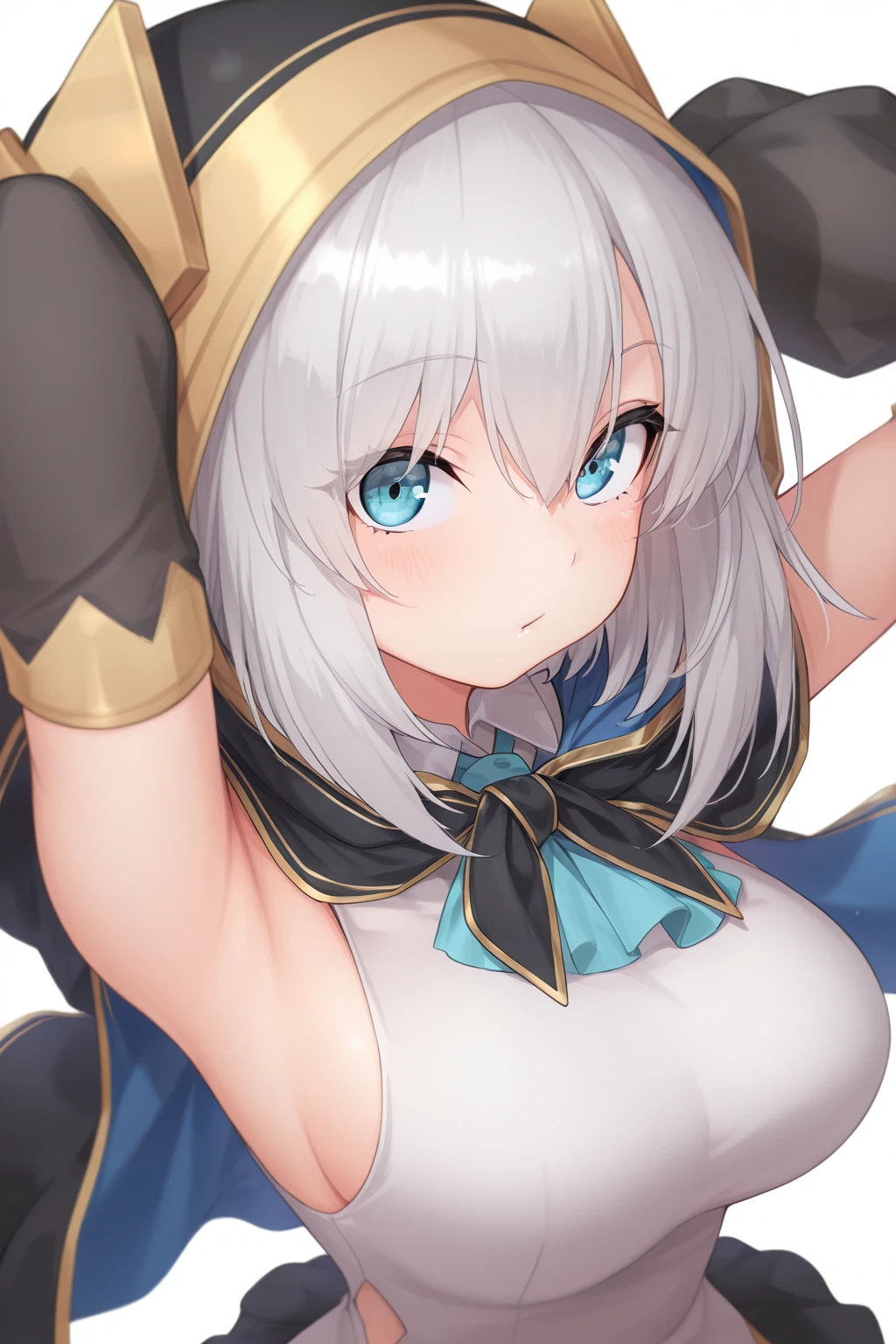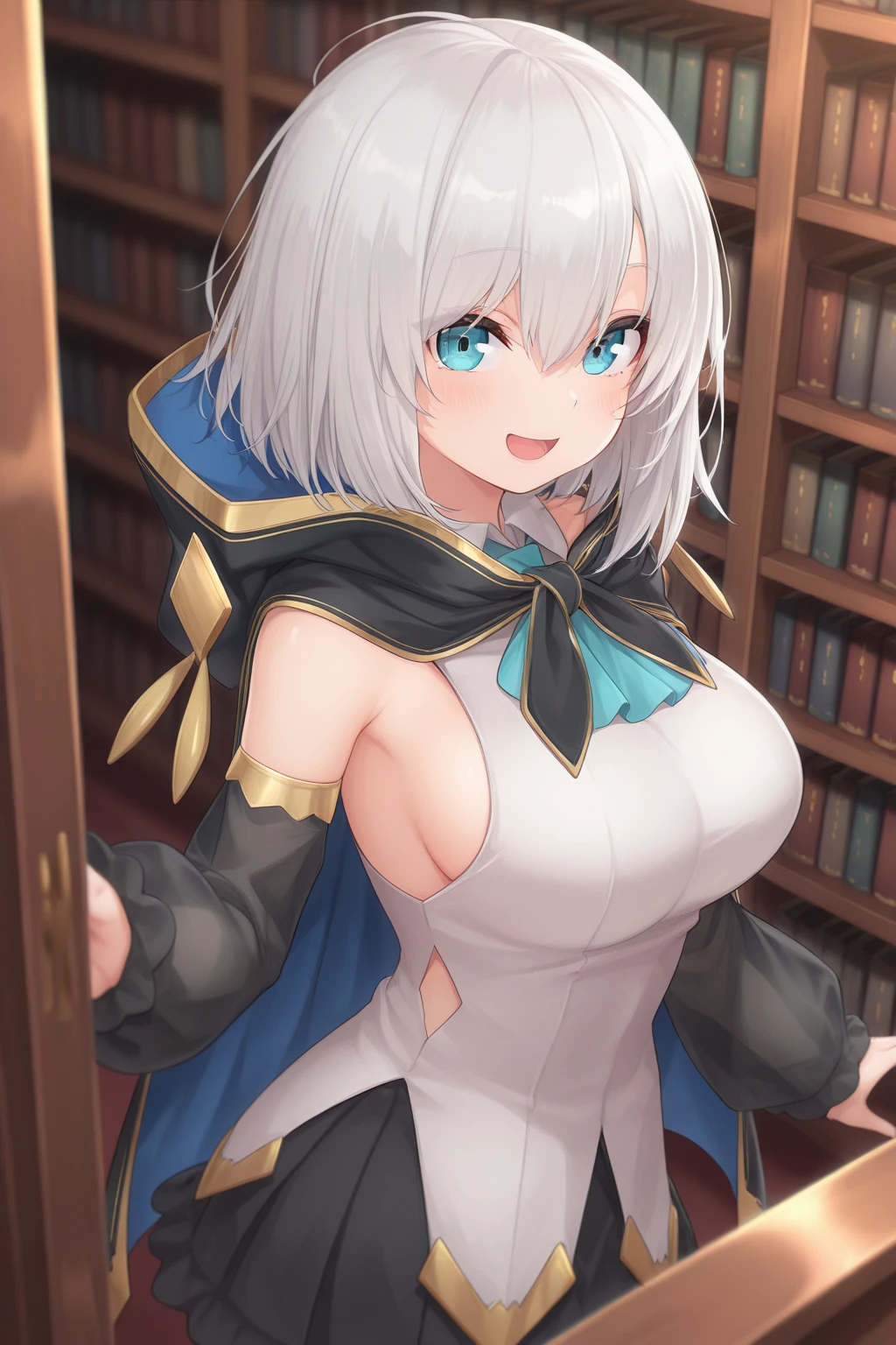 AA1stHairstyle, AA1stCostume, short hair, grey hair, blue eyes, eyelashes, hooded cape, shirts, detached sleeves, black sleeves, black skirt, knee boots