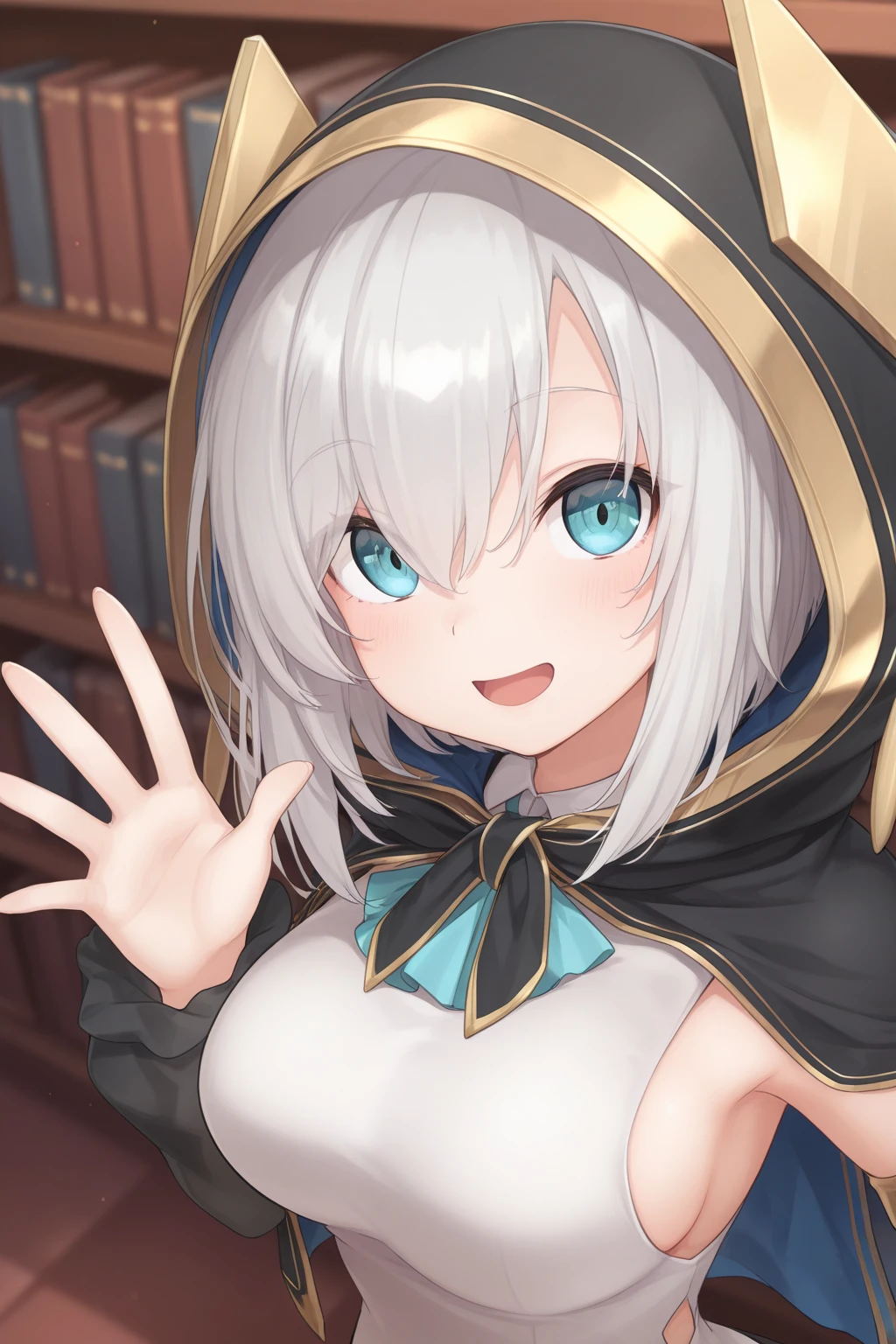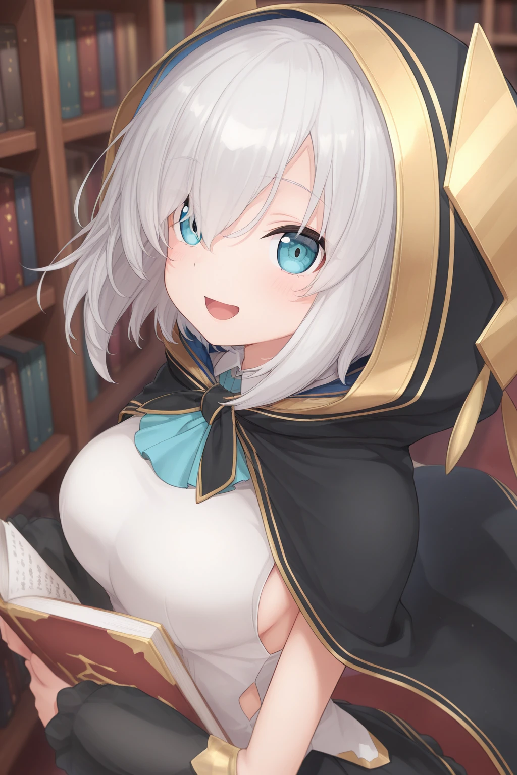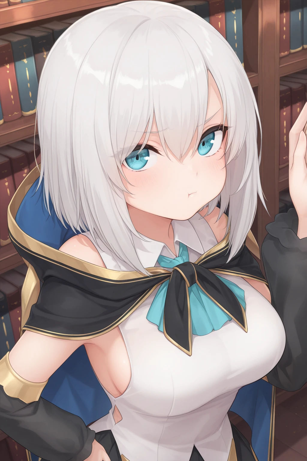 AA1stHairstyle, AA1stCostume, short hair, grey hair, blue eyes, eyelashes, hooded cape, shirts, detached sleeves, black sleeves, black skirt, knee boots