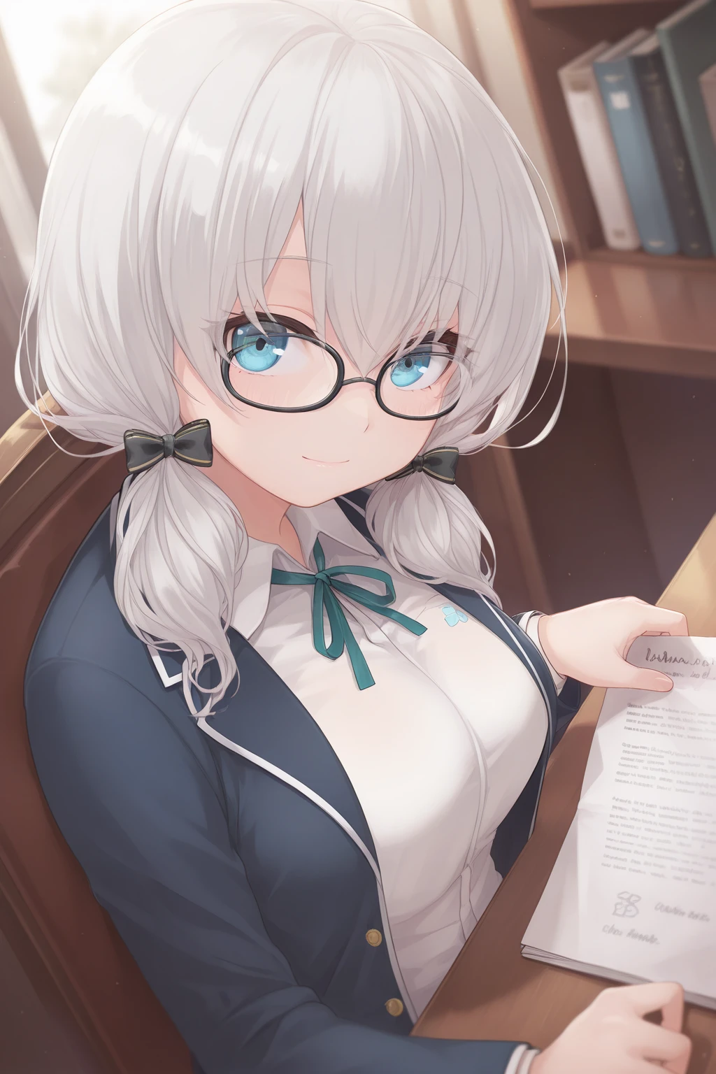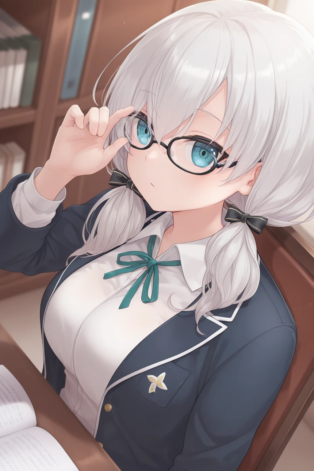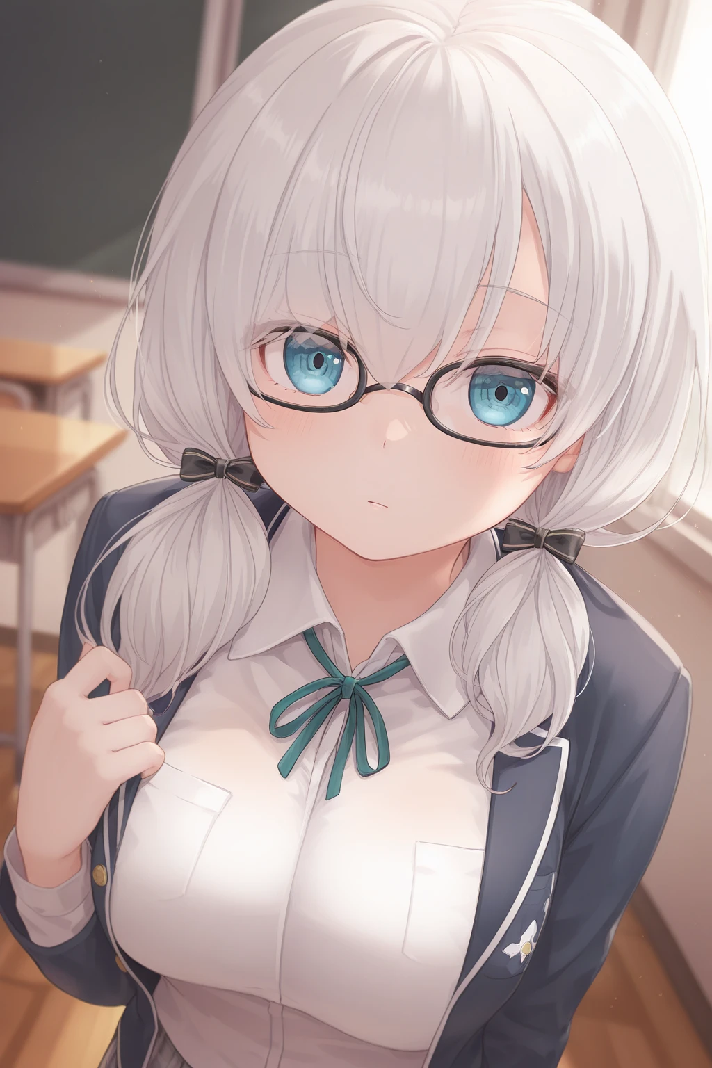 AA4thHairstyle, AA4thCostume, short hair, grey hair, low twintails, blue eyes, eyelashes, black-framed eyewear, hair bow, school uniform, blue jacket, green bowtie, white shirt, plaid skirt, black footwear