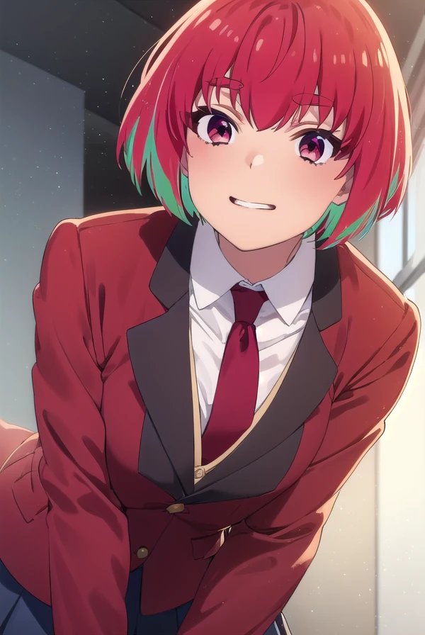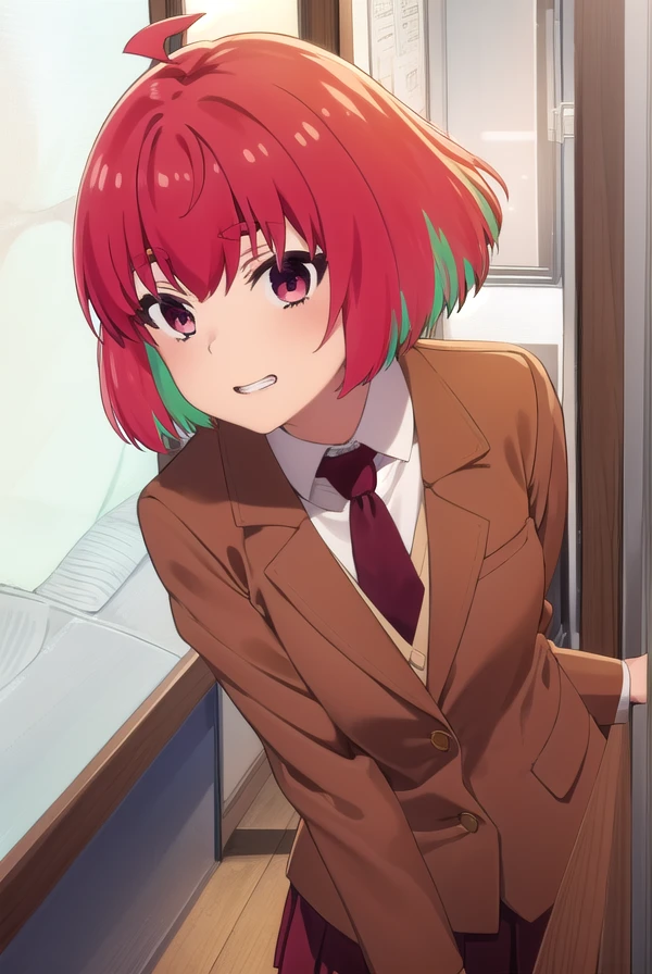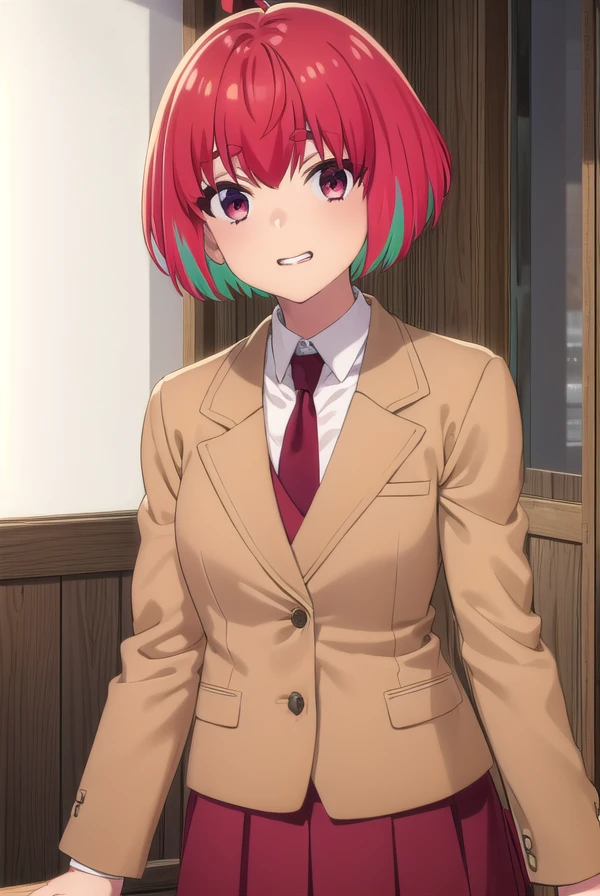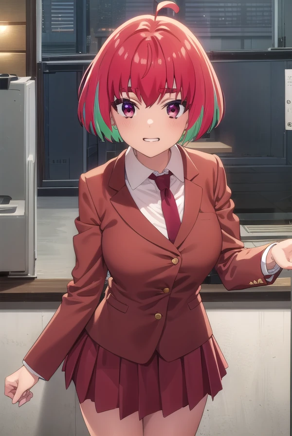kana fujii, short hair, bangs, (red eyes:1.3), ahoge, red hair, multicolored hair, green hair, two-tone hair, thick eyebrows,