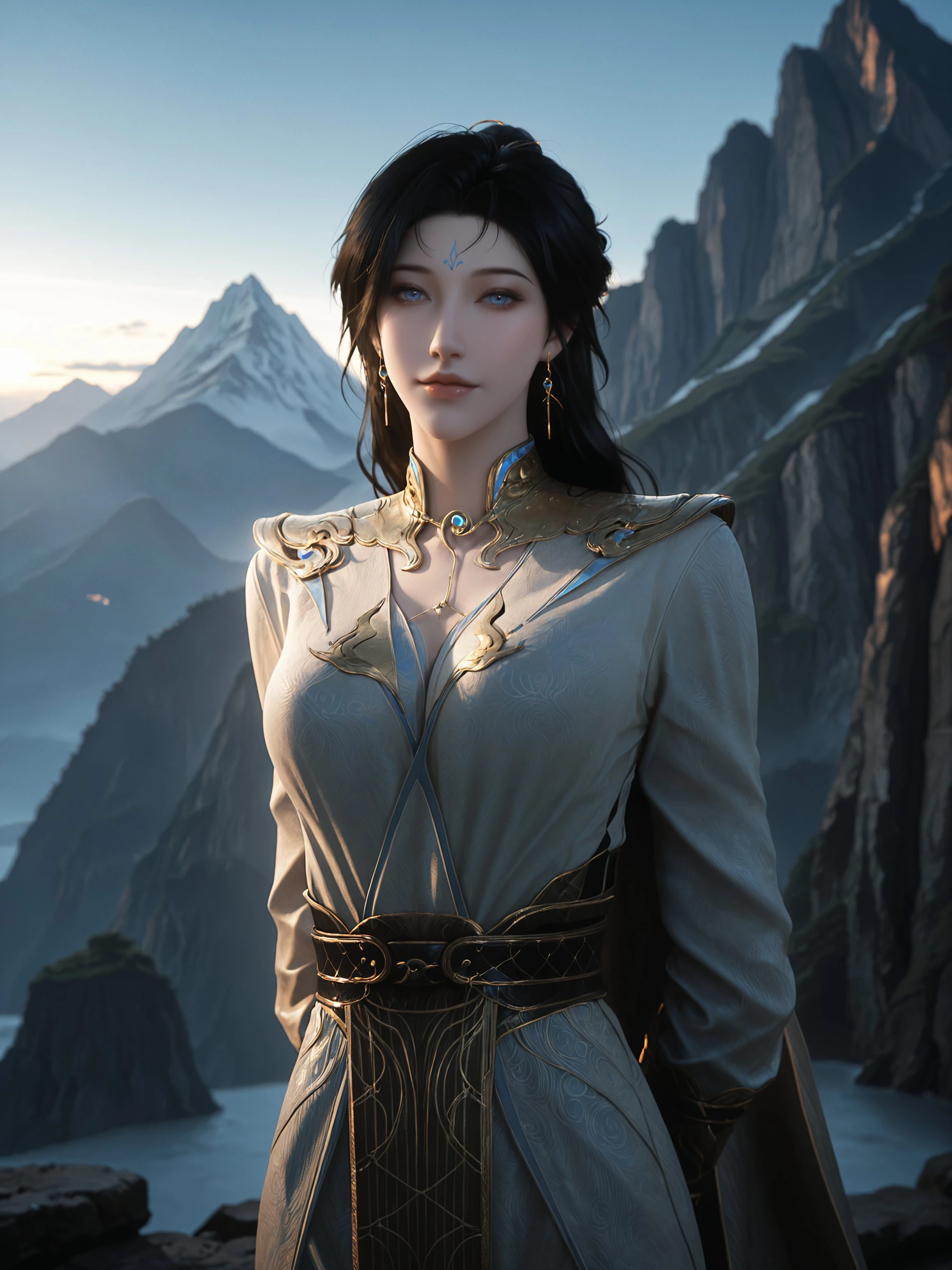 1girl, jewelry, solo, blue eyes, earrings, black hair, dress, long hair, long sleeves, lips, forehead mark, facial mark