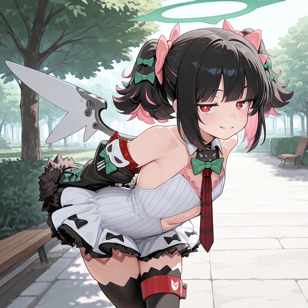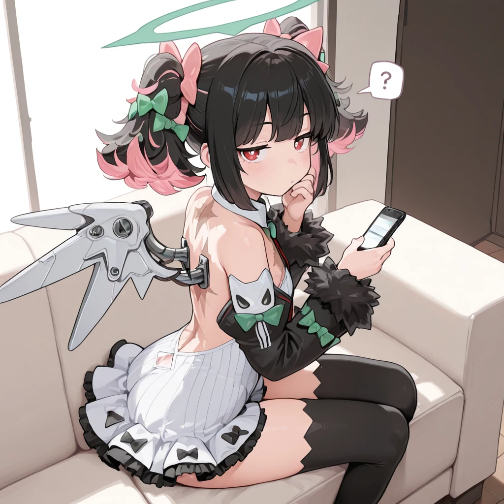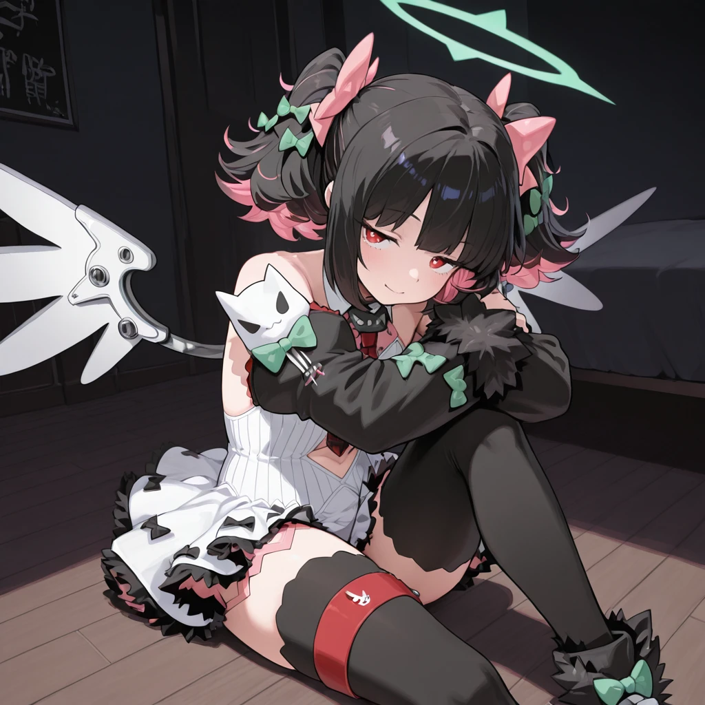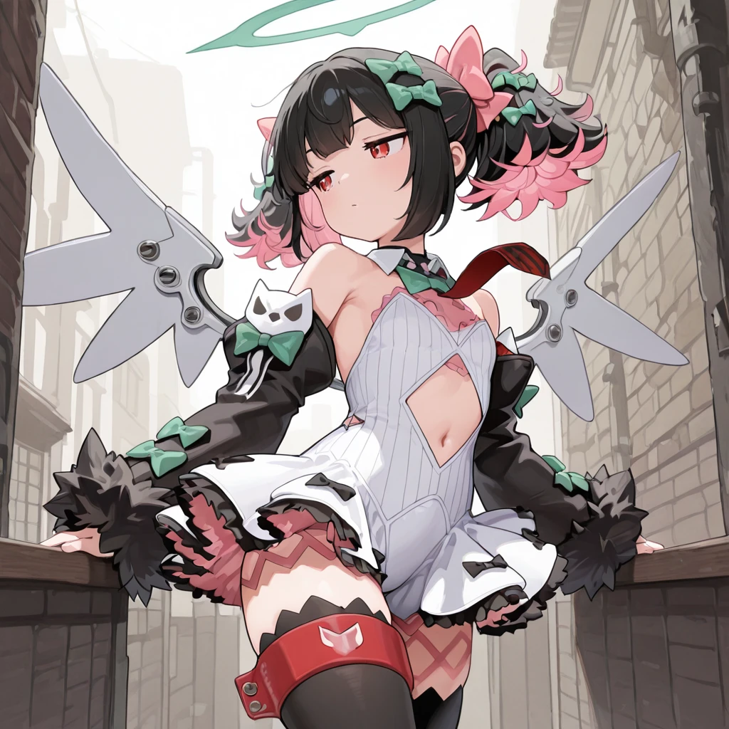 zzzrokudo, red eyes, jitome, flat chest, twintails, multicolor hair, black hair, pink hair, hair bow, green bow, pink bow, white dress, frilled skirt, detached sleeves, fur trim, navel cutout, red necktie, black thighhighs, halo, mechanical wings,