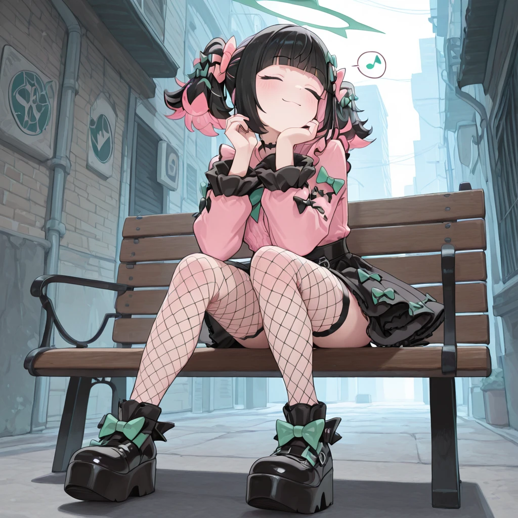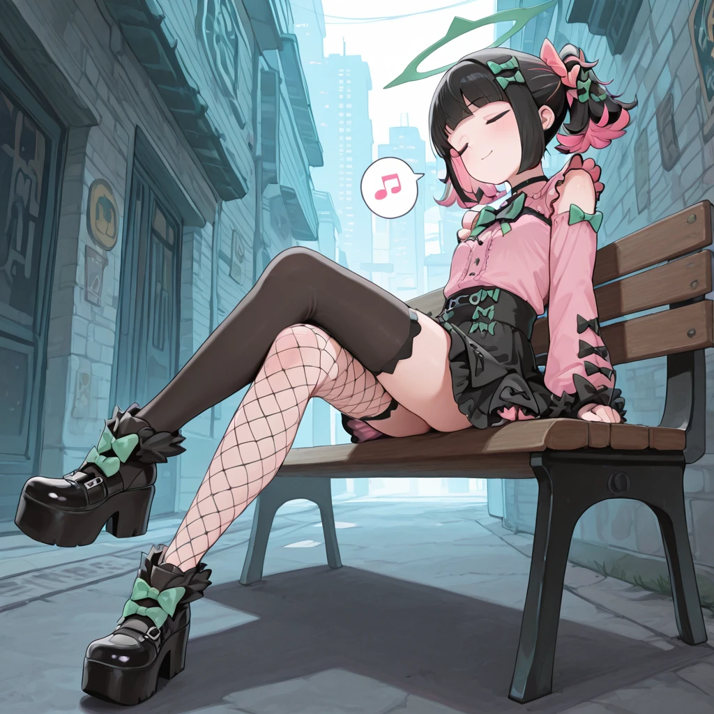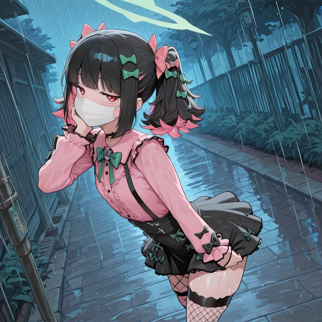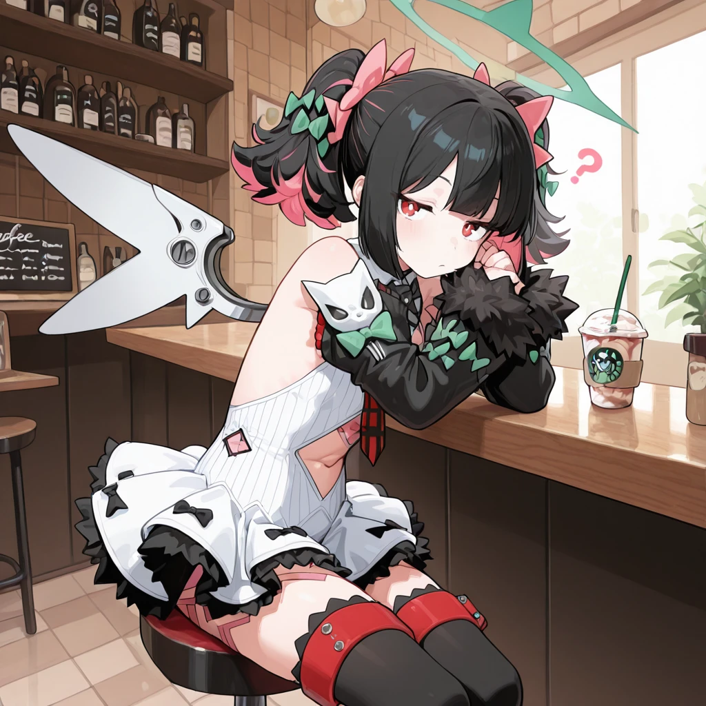 zzzrokudo, red eyes, jitome, flat chest, twintails, multicolor hair, black hair, pink hair, hair bow, green bow, pink bow, white dress, frilled skirt, detached sleeves, fur trim, navel cutout, red necktie, black thighhighs, halo, mechanical wings,