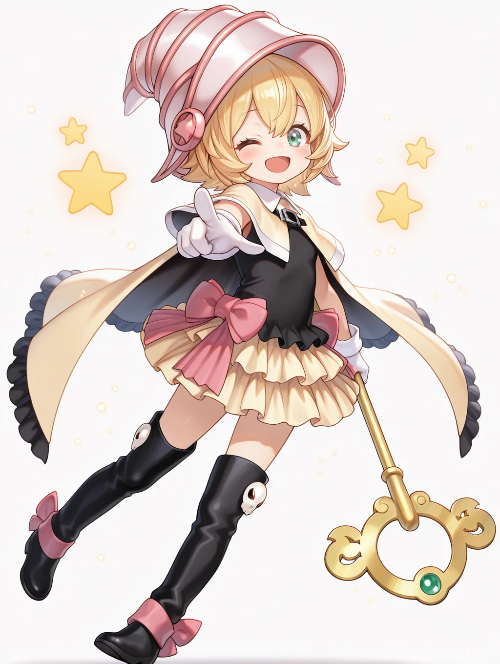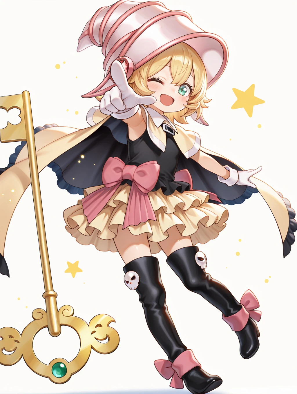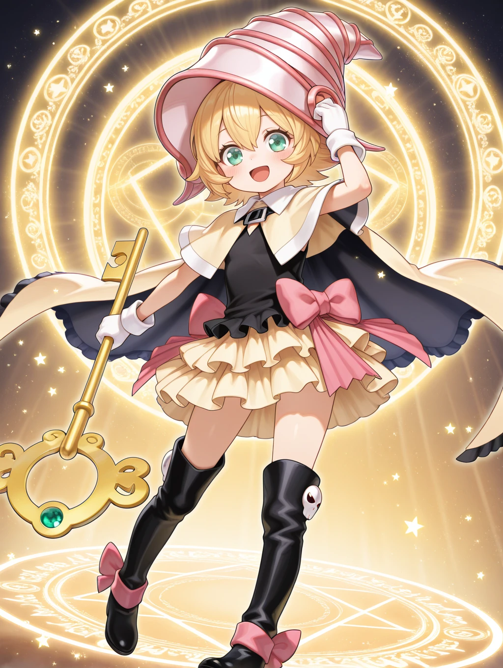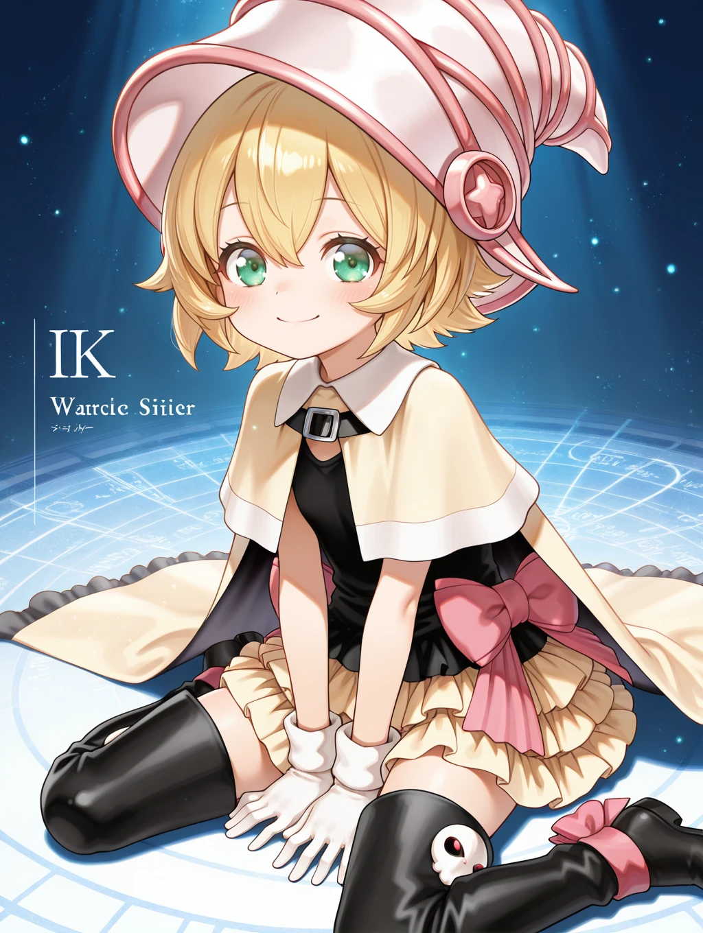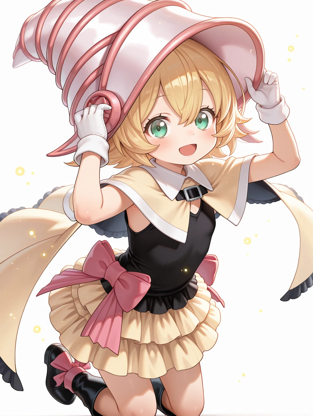 Tags (clothes): white wizard hat, yellow capelet, black sleeveless shirt, pink waist bow, yellow frilled skirt, white gloves, black knee boots, pink ankle bow
