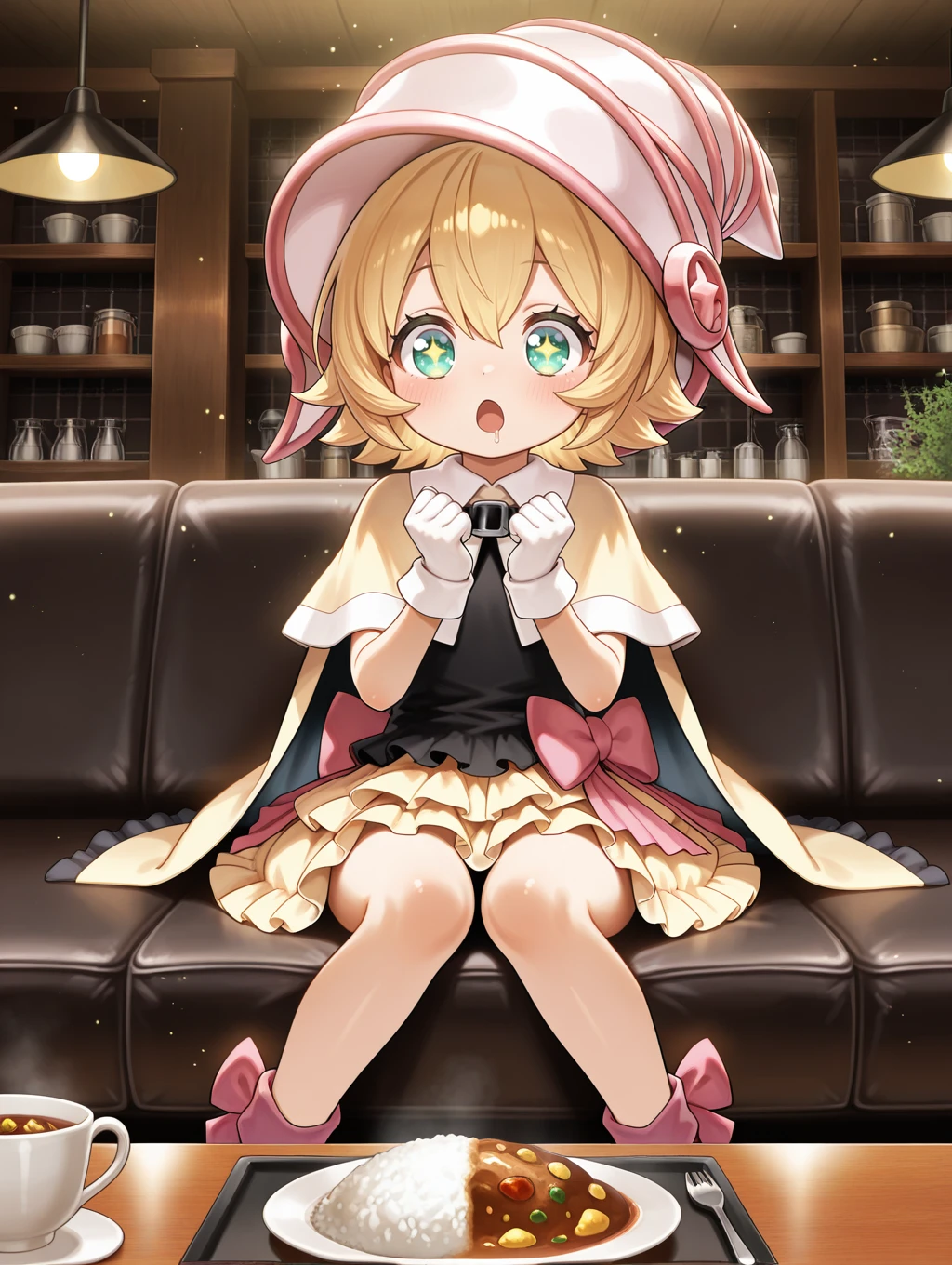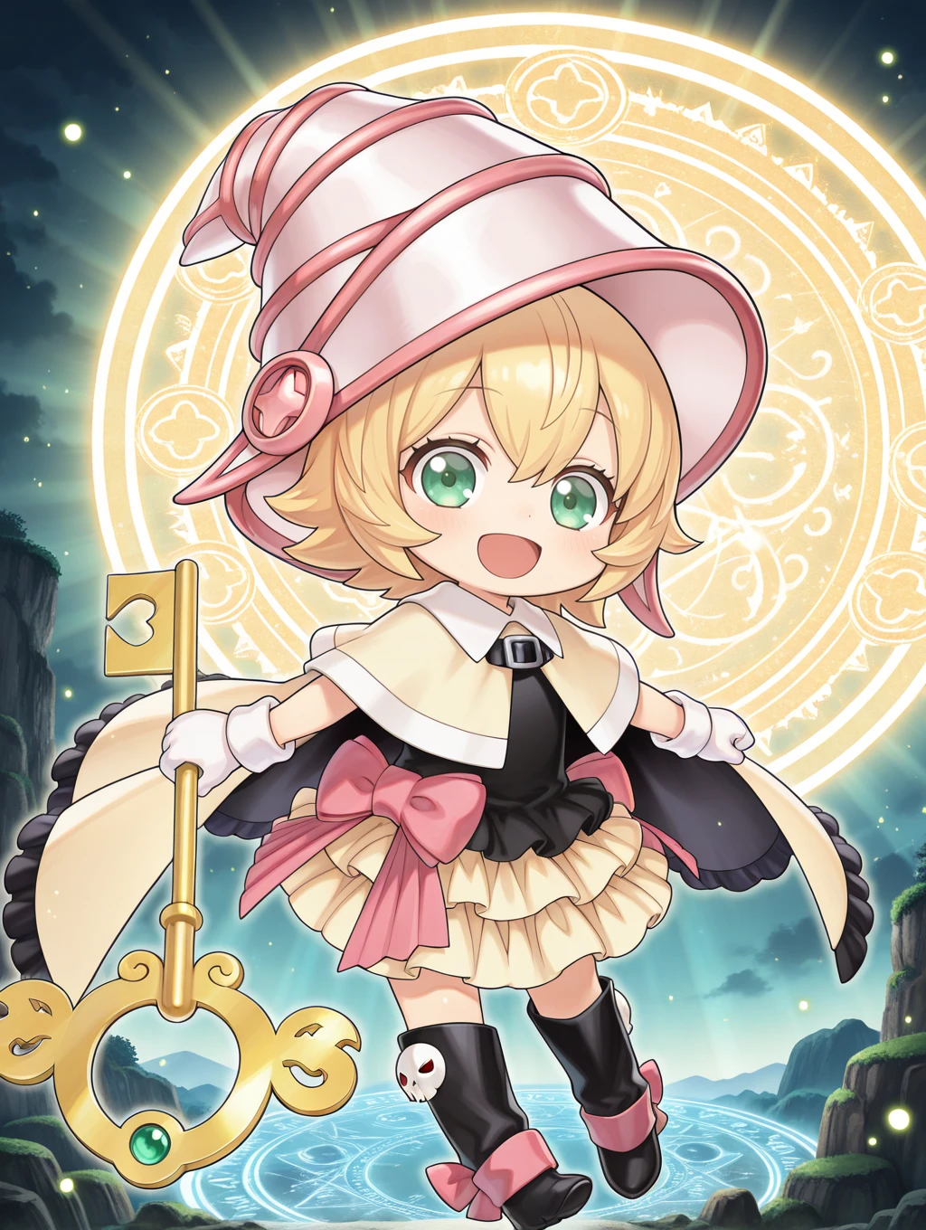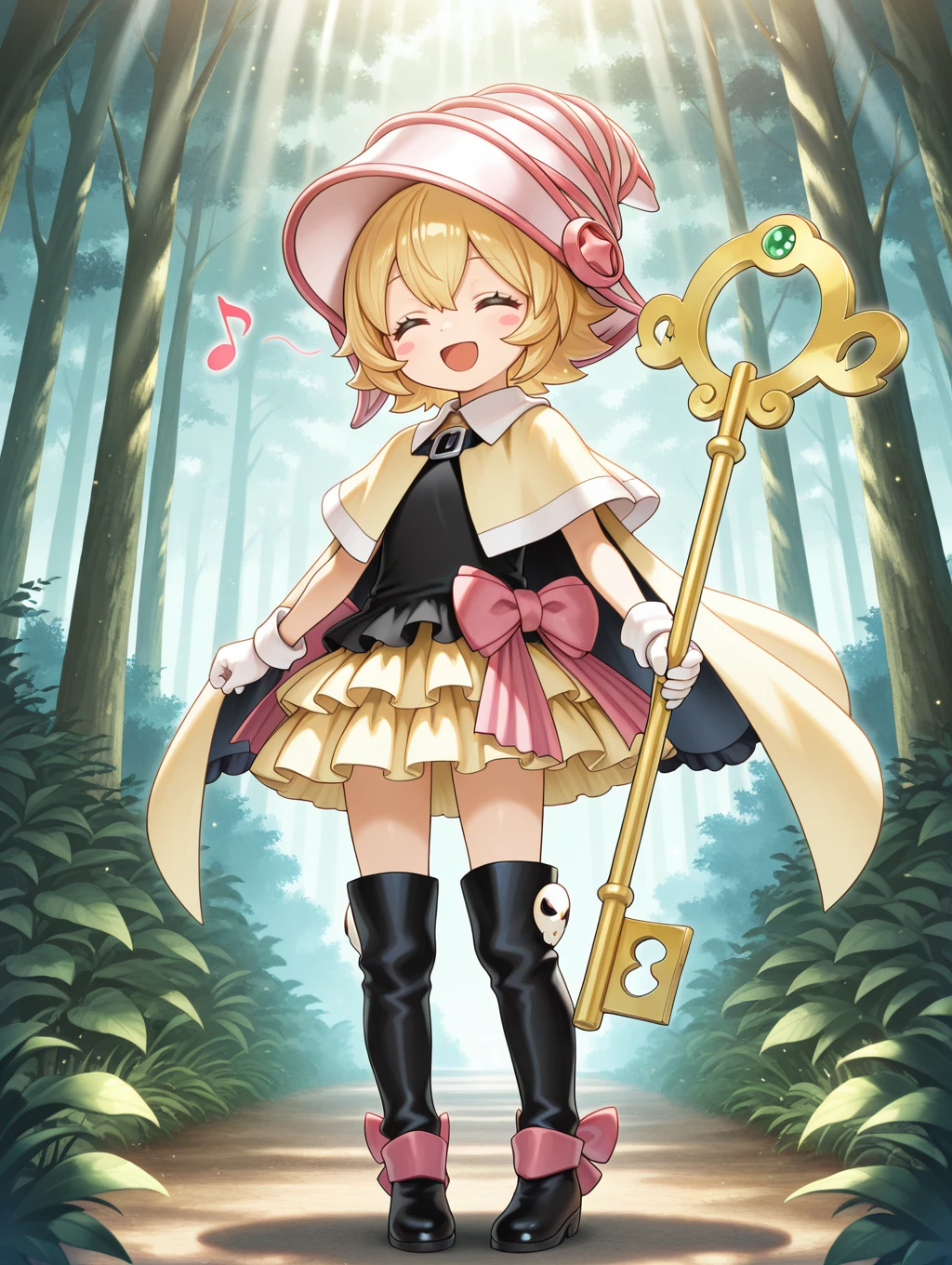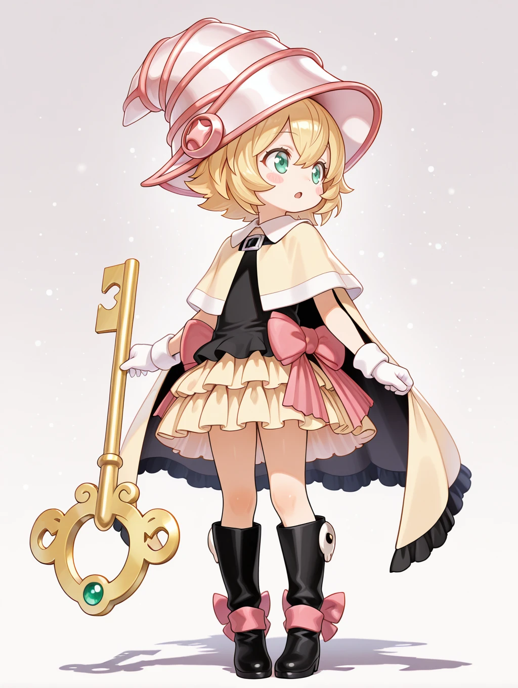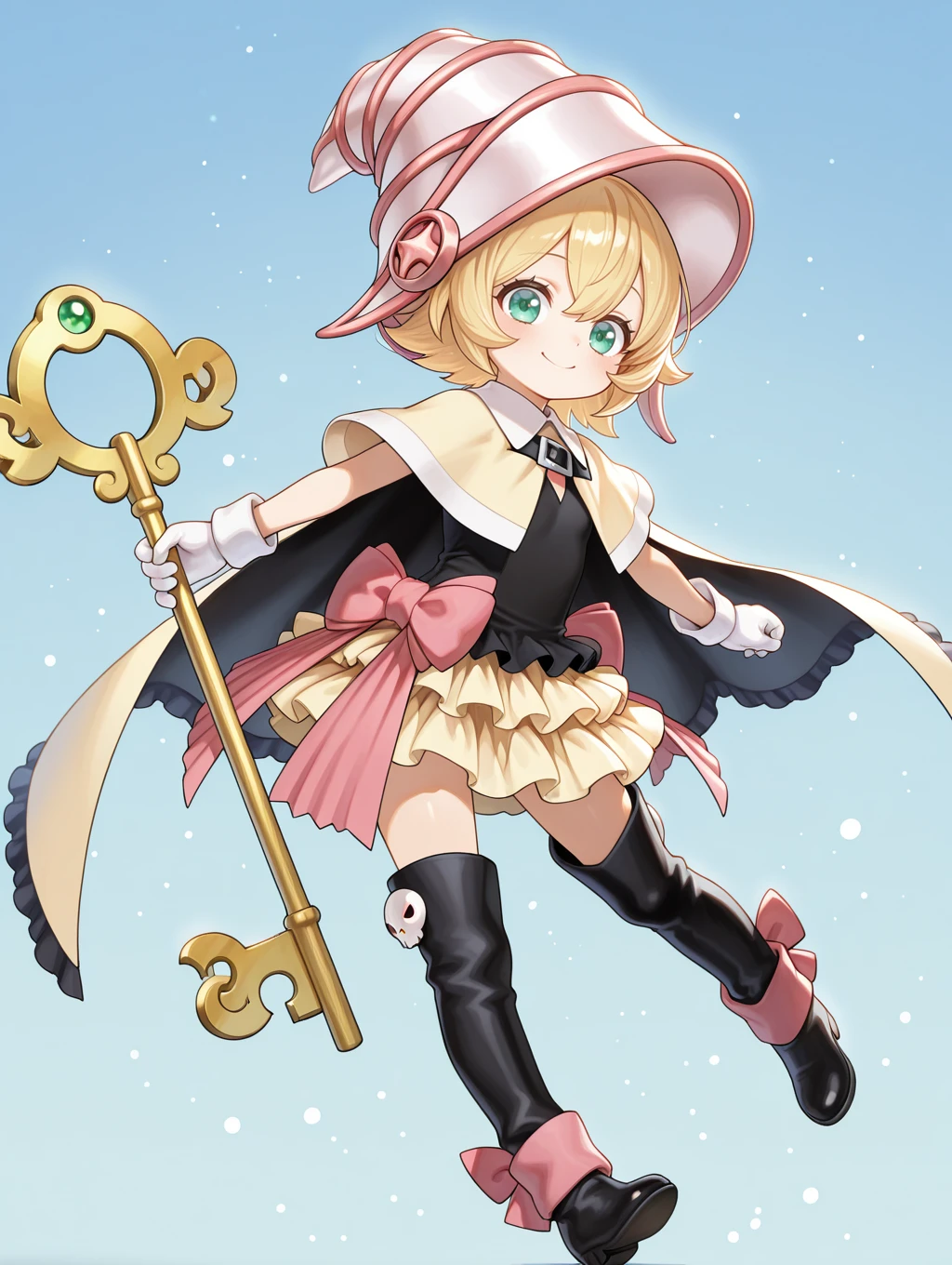 Tags (clothes): white wizard hat, yellow capelet, black sleeveless shirt, pink waist bow, yellow frilled skirt, white gloves, black knee boots, pink ankle bow