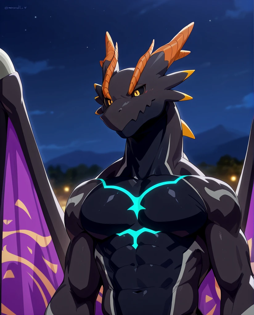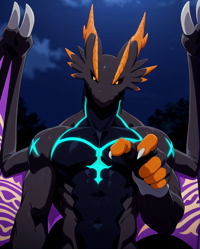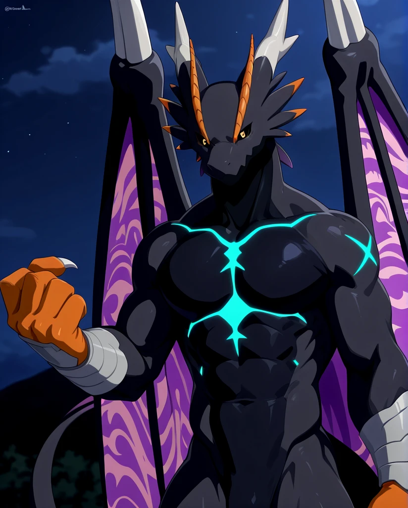Illusia_Lv2 DoraTama, dragon, gray and black body, multiple body colors, orange hand, orange feet, orange eyebrow, black sclera, purple iris, yellow pupil, glowing blue pattern, claws, purple wings, tail,
