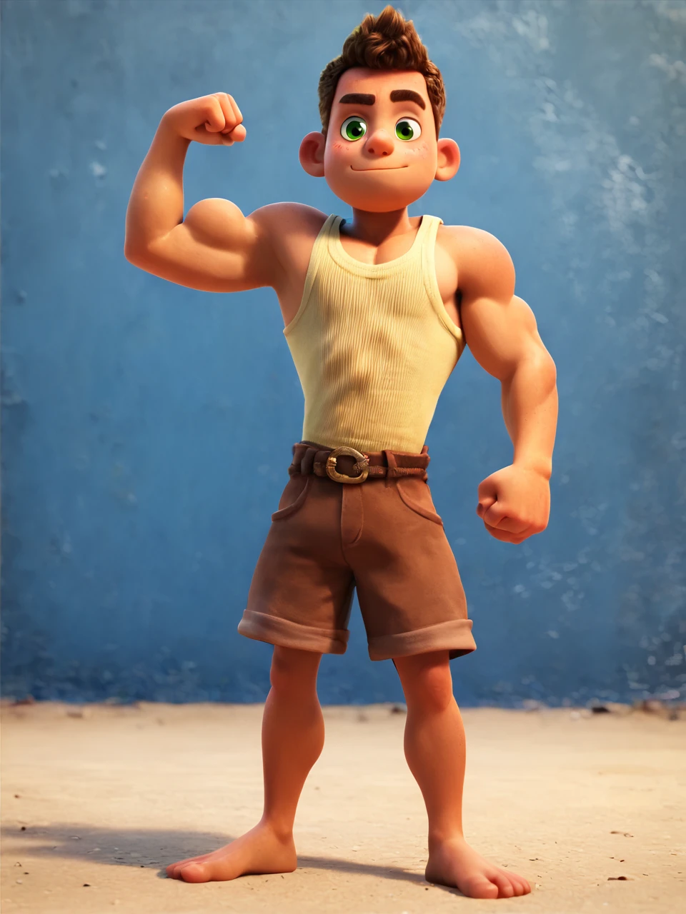 AlbScorf, green eyes, brown hair, tank top, belt, brown shorts, barefoot,