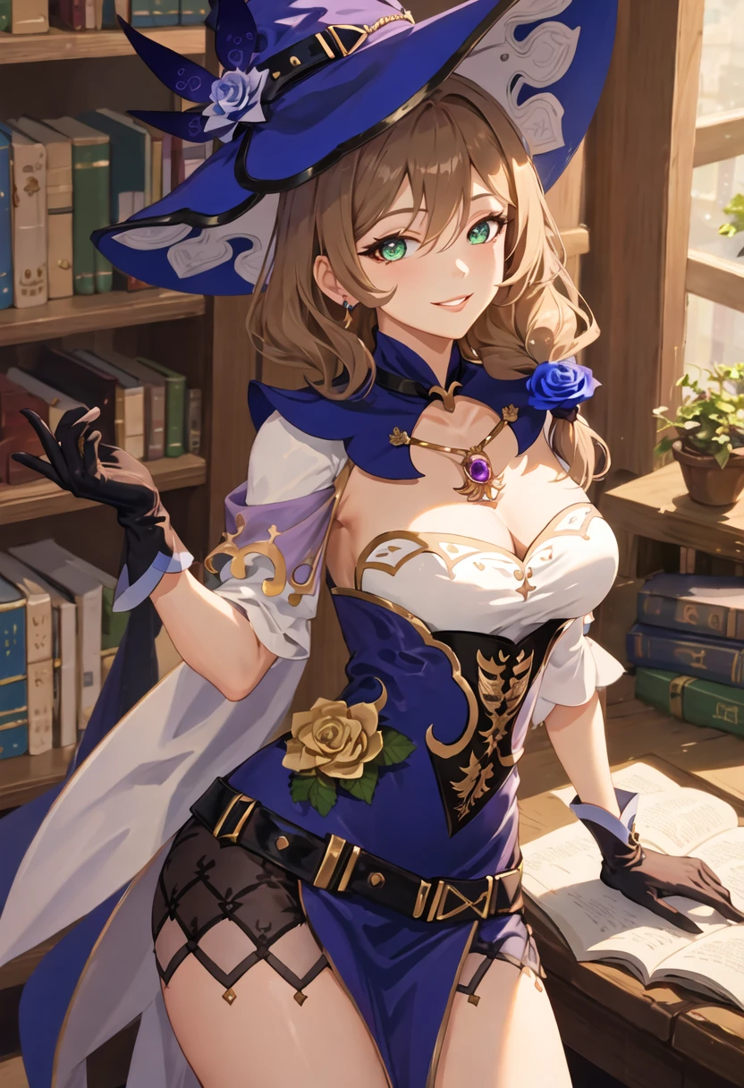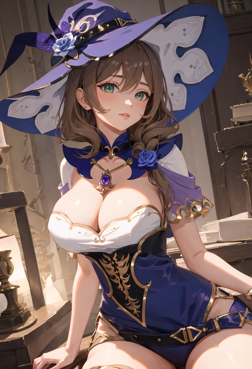 The trigger word is lisa_genshin, and the pruned tags are long_hair, breasts, green_eyes, brown_hair, bangs, large_breasts, hat, witch_hat, purple_headwear, hair_between_eyes, hair_ornament, hair_flower.