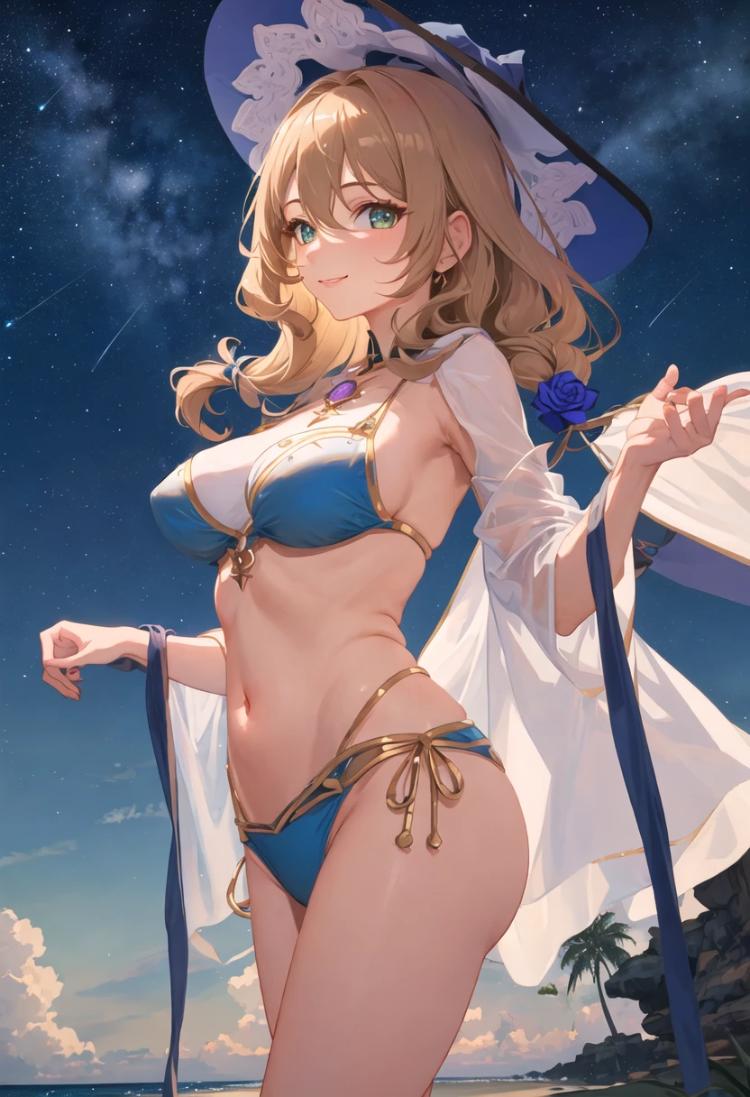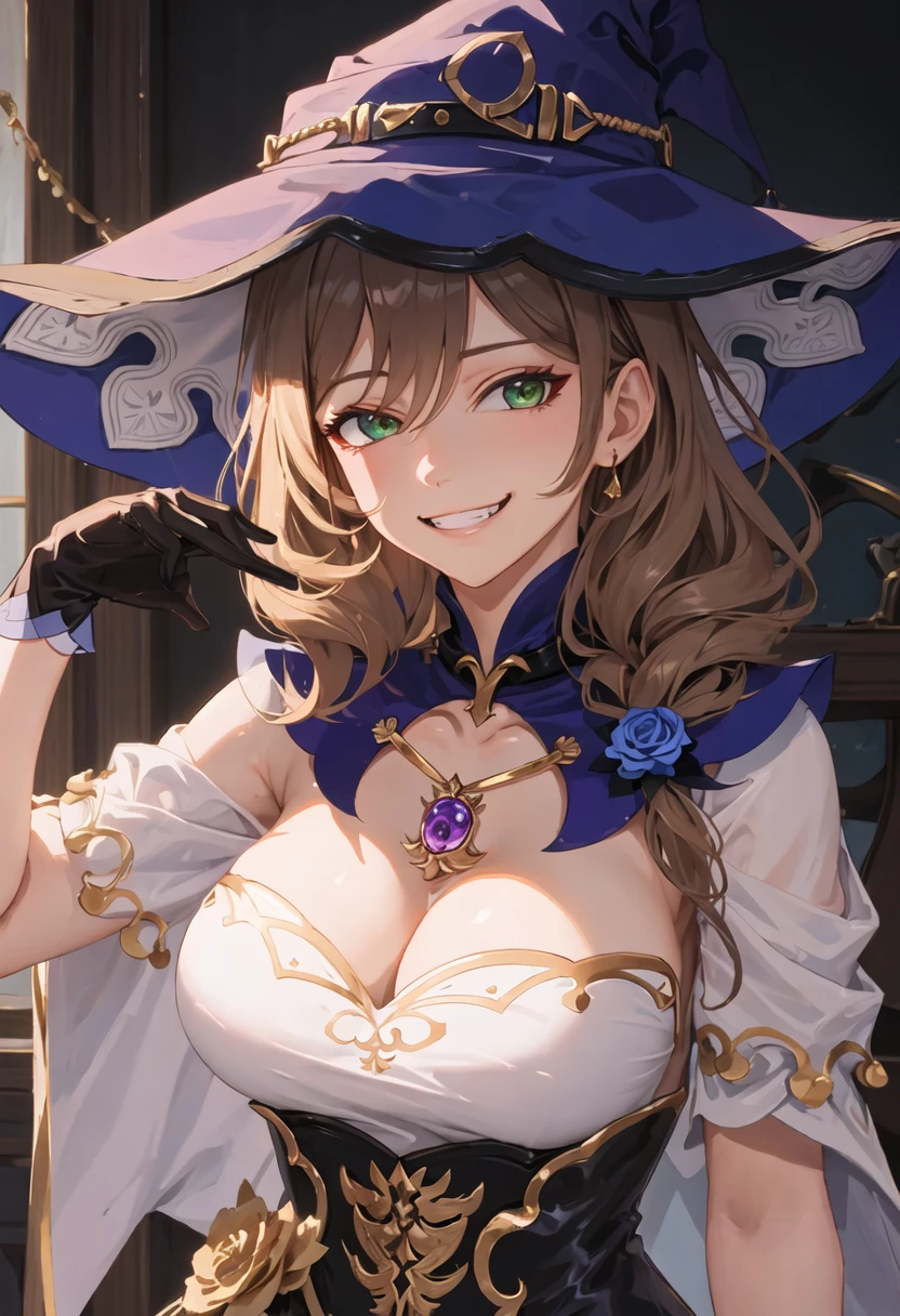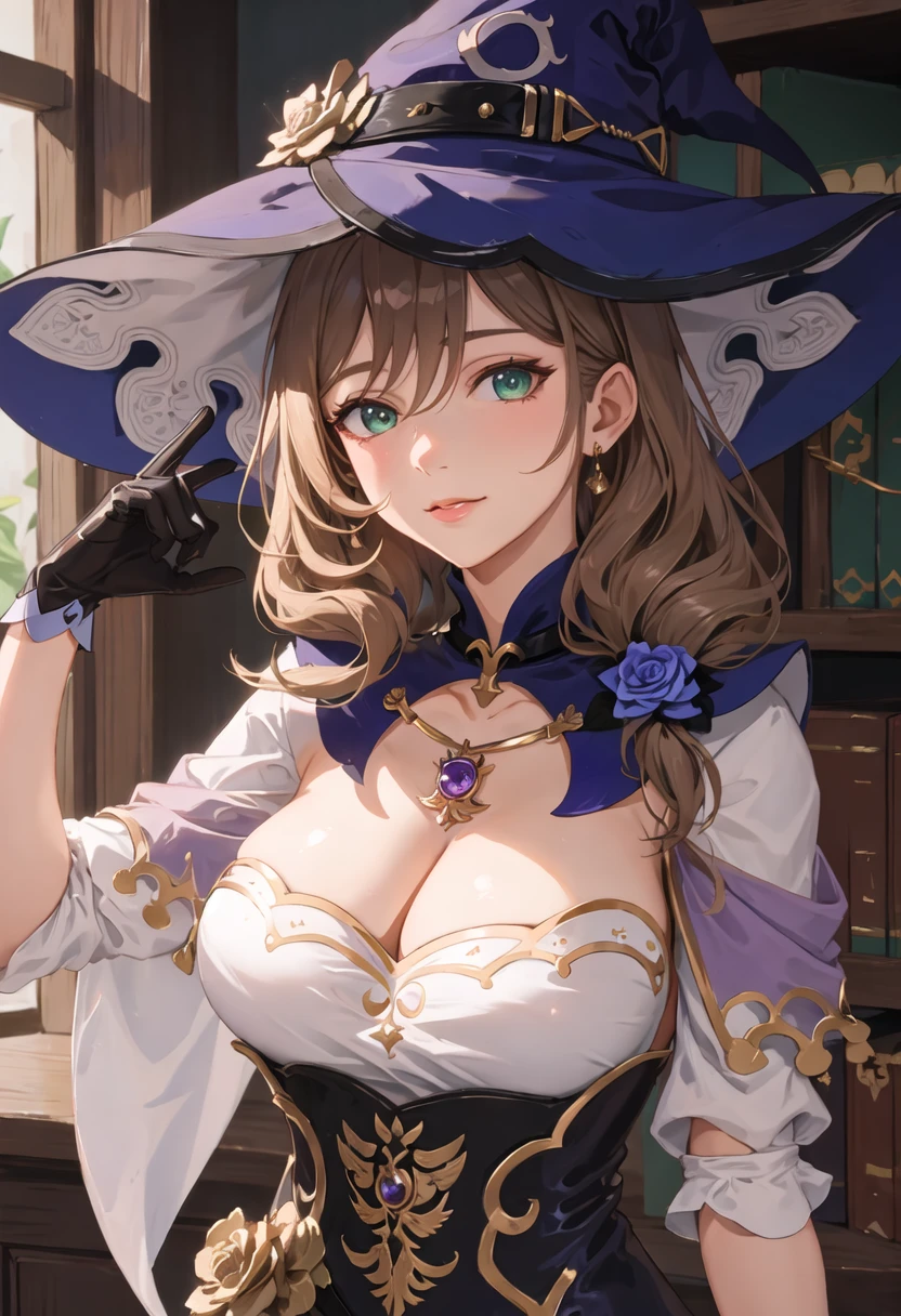 - The pruned character tags are long_hair, breasts, green_eyes, brown_hair, bangs, large_breasts, hat, witch_hat, purple_headwear, hair_between_eyes, hair_ornament, hair_flower. You can add them into prompts when core features (e.g. hair color) of character is not so stable.