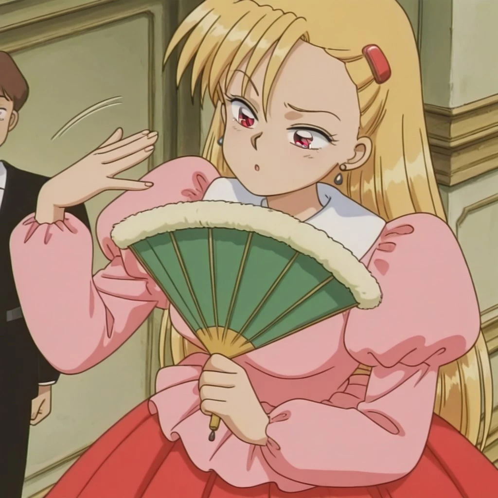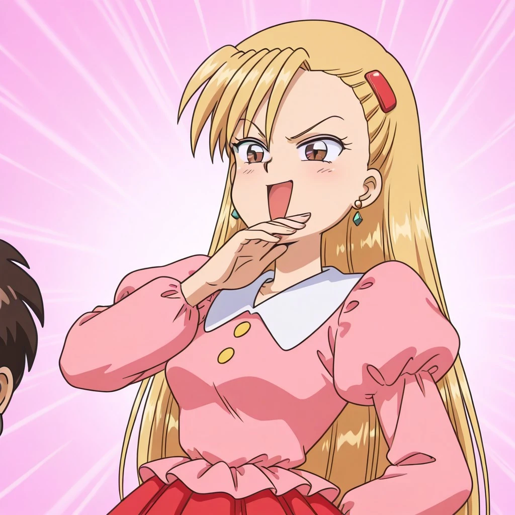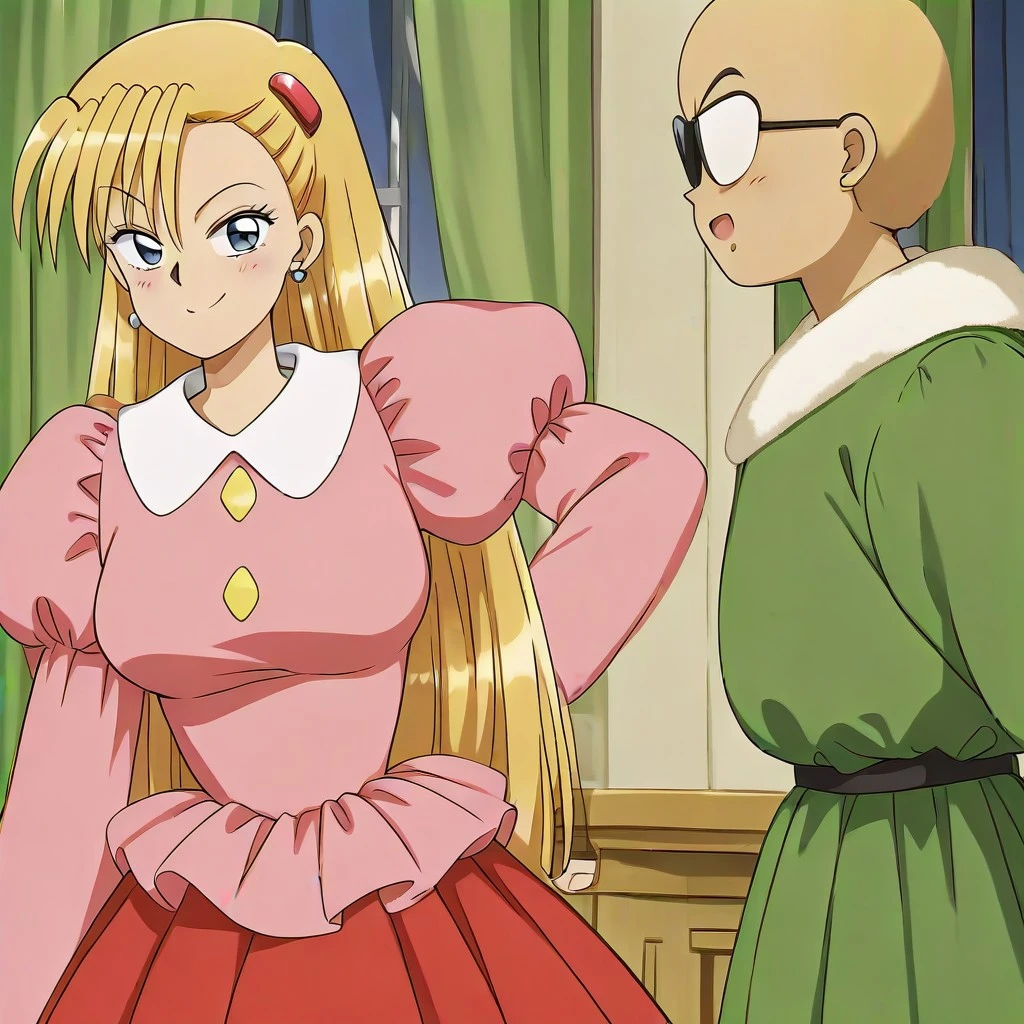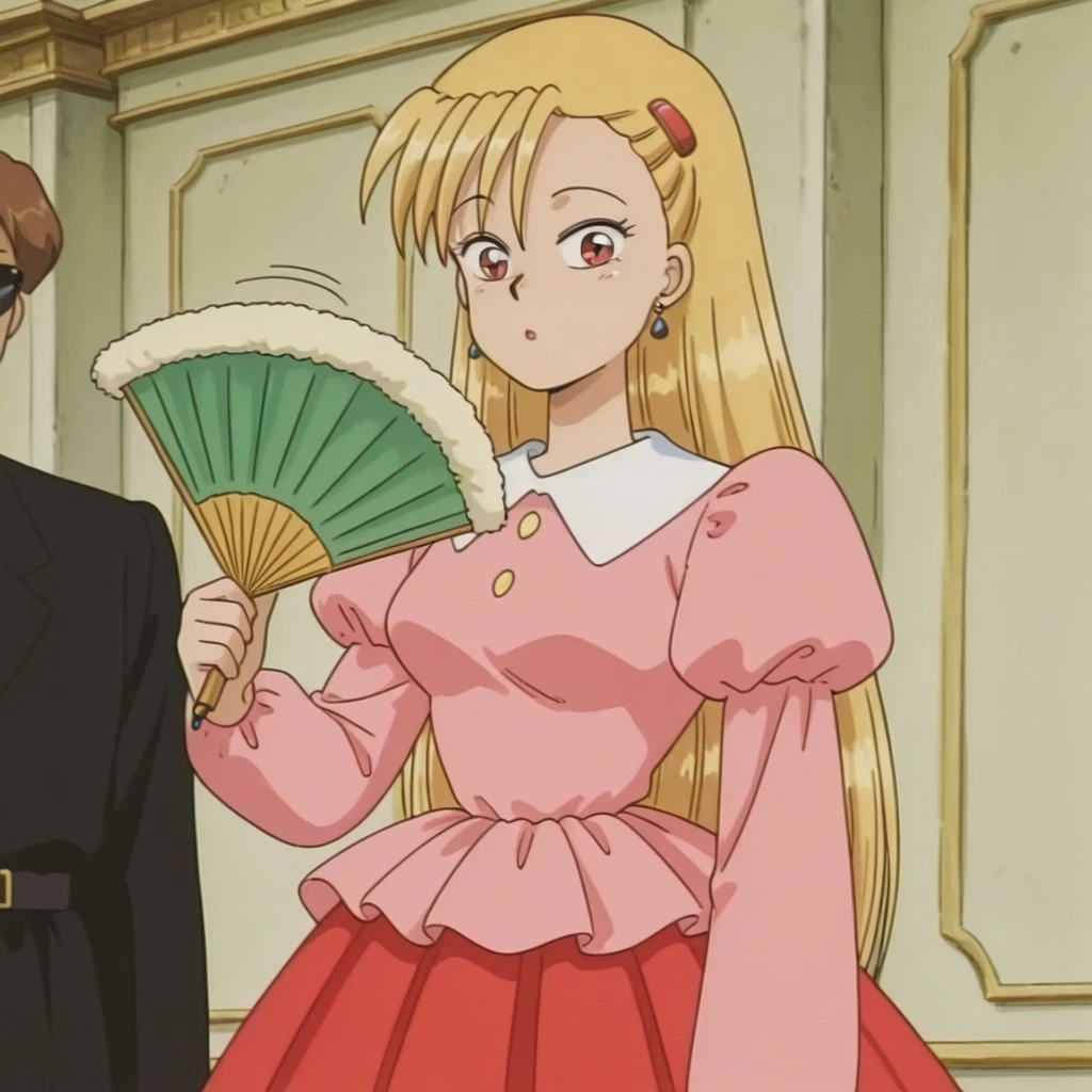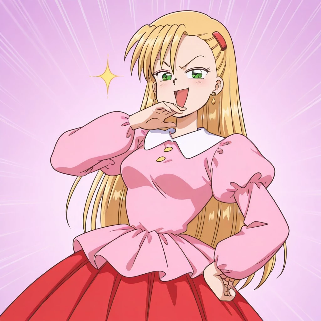 Anime, 1man, solo, trap, brown eyes, long blonde wig, earrings , red hair clip, eyelashes, pink blouse, long poofy sleeves, blouse with a white collar, blouse with a frilled hem , long skirt, hoopskirt, red skirt,