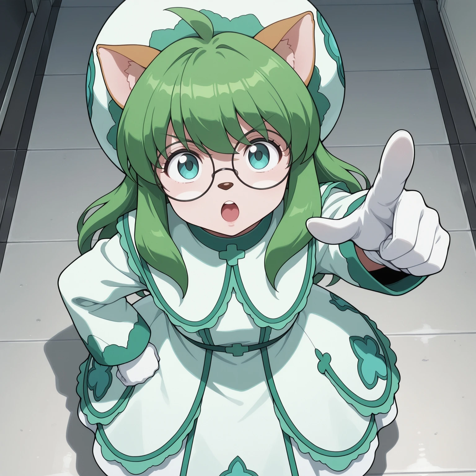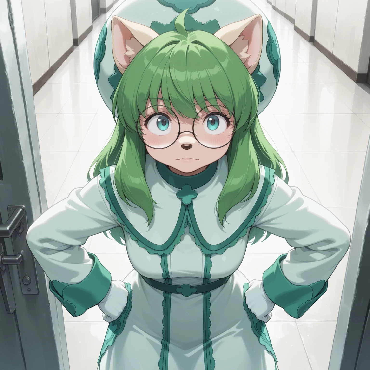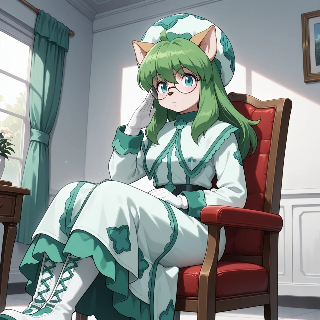 cheadle_yorkshire,dog ears,animal nose, round eyewear, green eyes, hat, white gloves, white dress, white boots