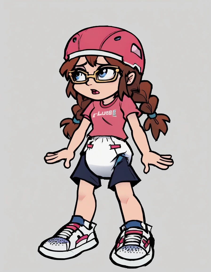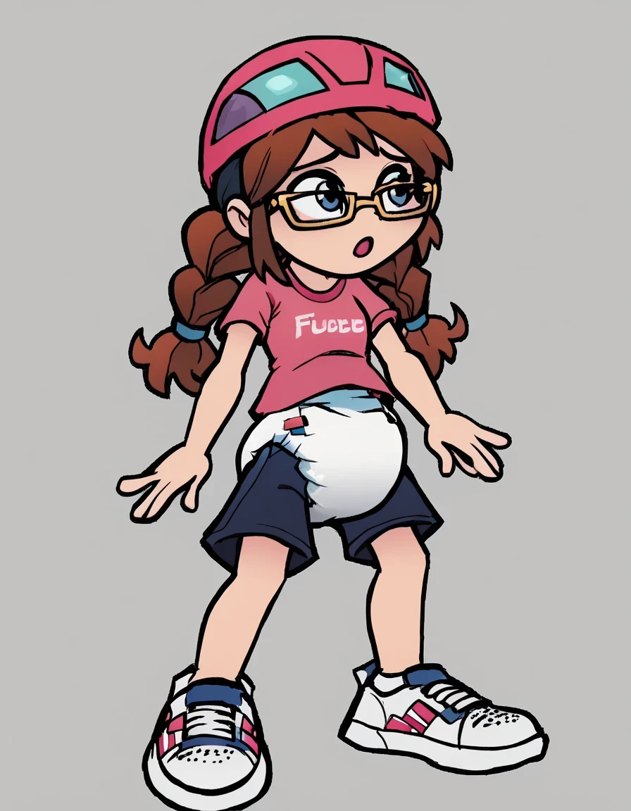 FeeBeeSML, 1girl, long hair, blue eyes, shirt, brown hair, braid, short sleeves, shorts, shoes, gold glasses, twin braids, headband, white footwear, sneakers, t-shirt, english text on shirt, blue shorts, pink shirt, diaper outside of shorts, pink bicycle helmet,