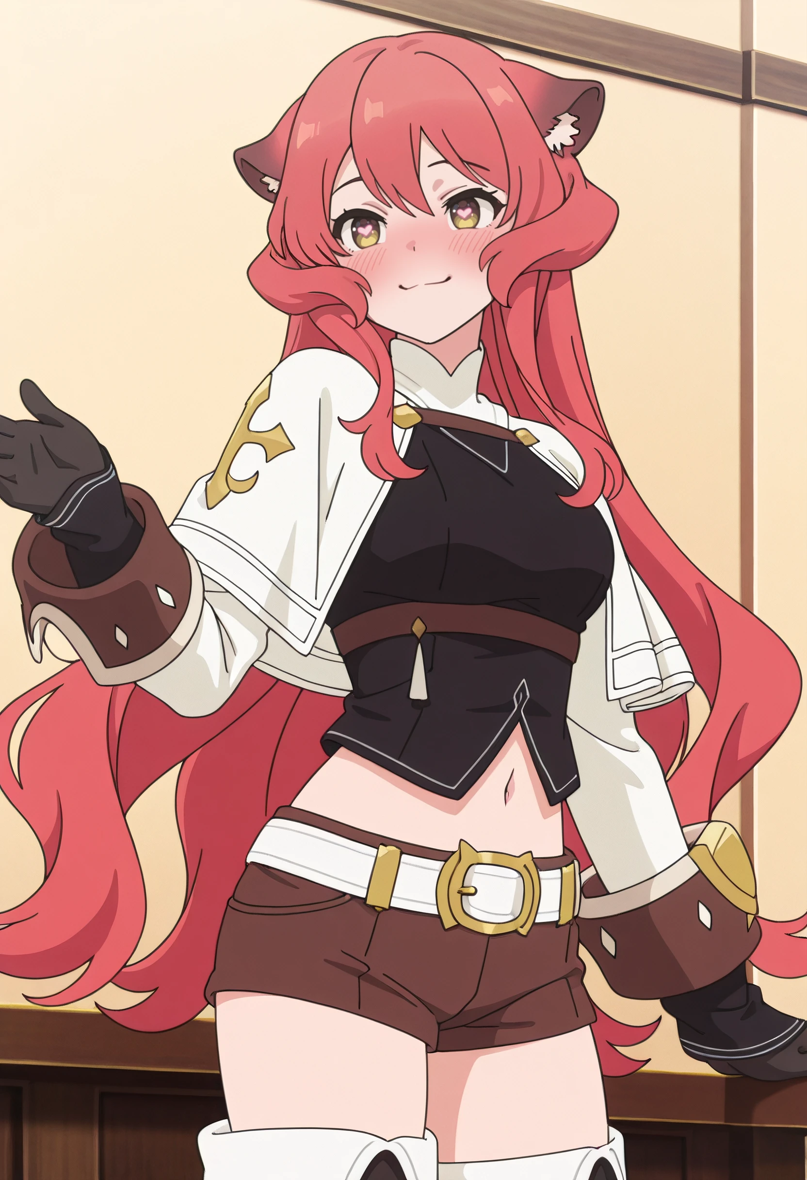 MianneOutfit, black gloves, belt, boots, long sleeves, black shirt, shorts, thigh boots, white belt, navel, black footwear, short shorts, midriff, white capelet, brown shorts, crop top, high heels, high heel boots, miniskirt,