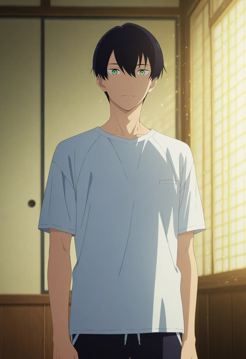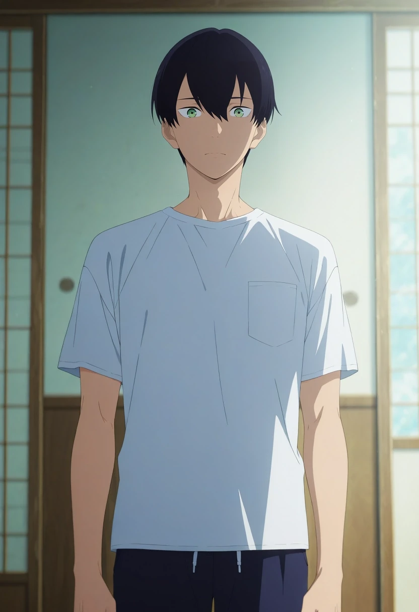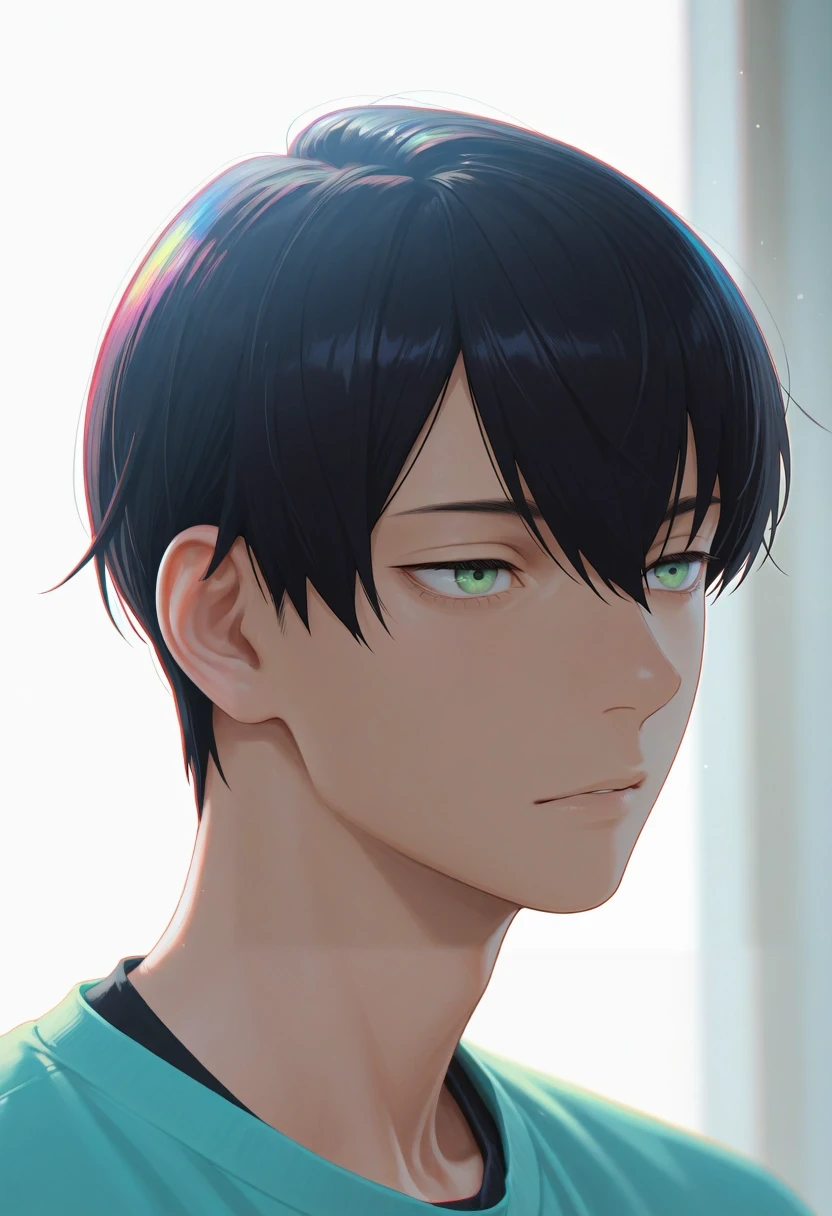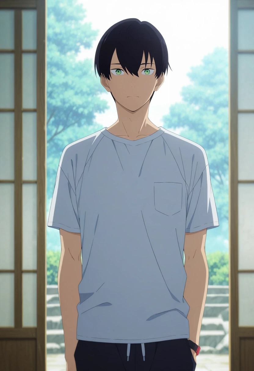 tsuneo_suzukawa, black hair, green eyes, short hair, bangs, hair between eyes