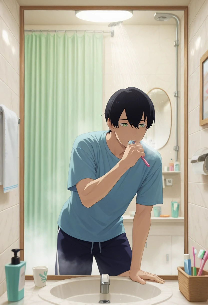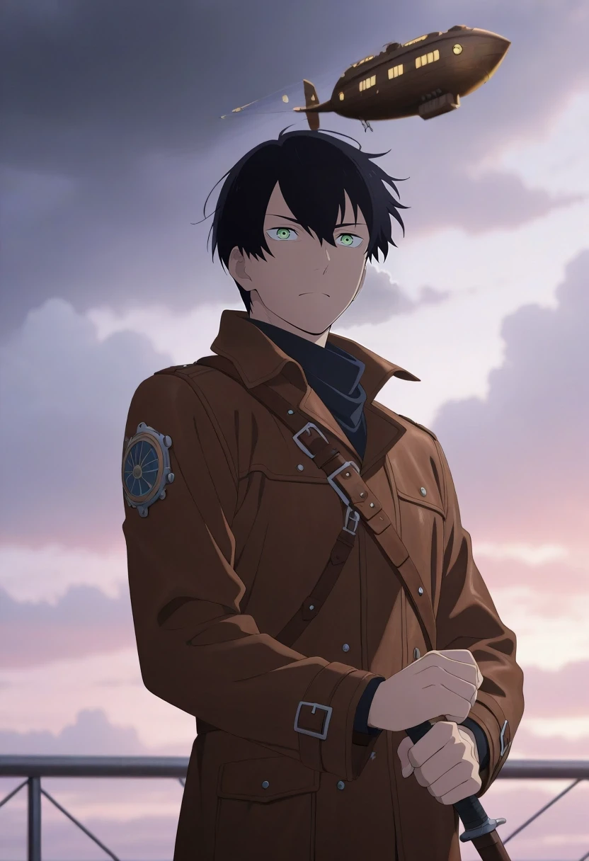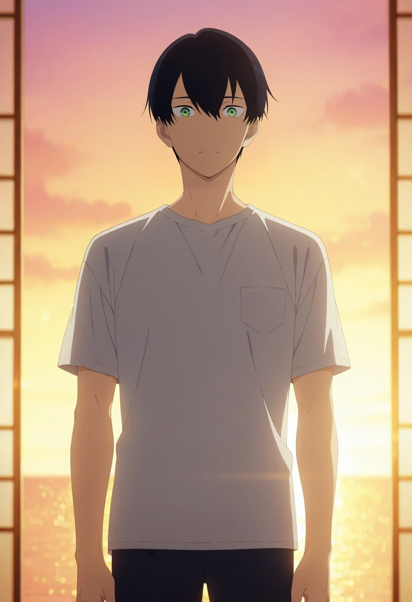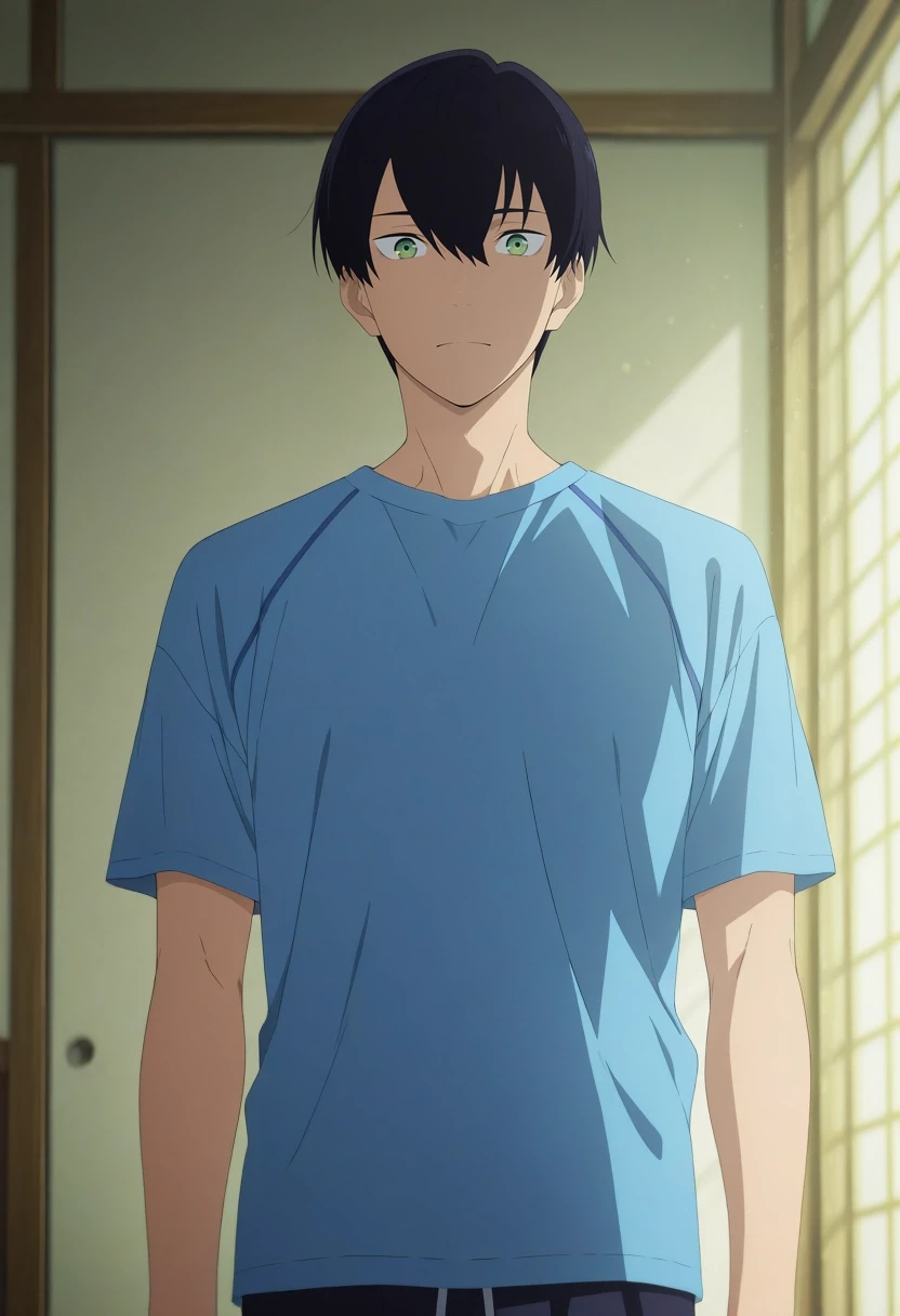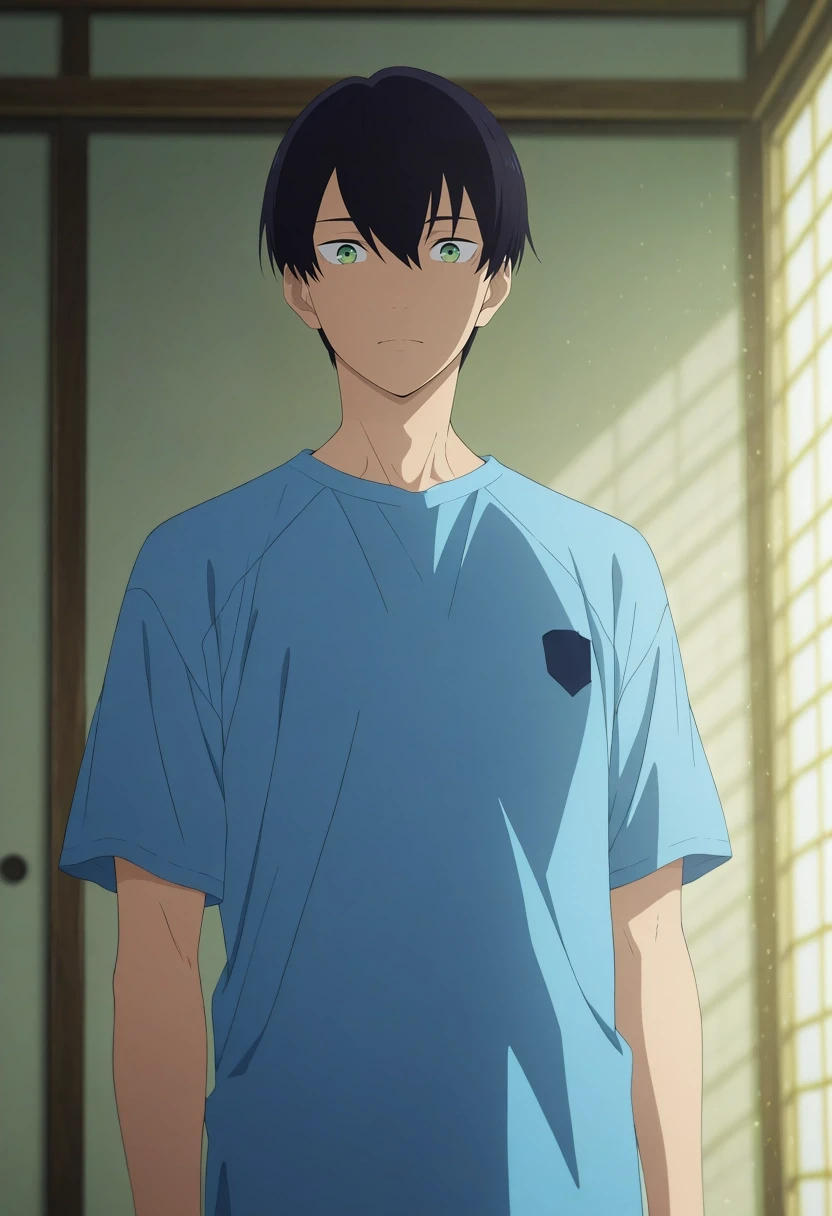 tsuneo_suzukawa, black hair, green eyes, short hair, bangs, hair between eyes