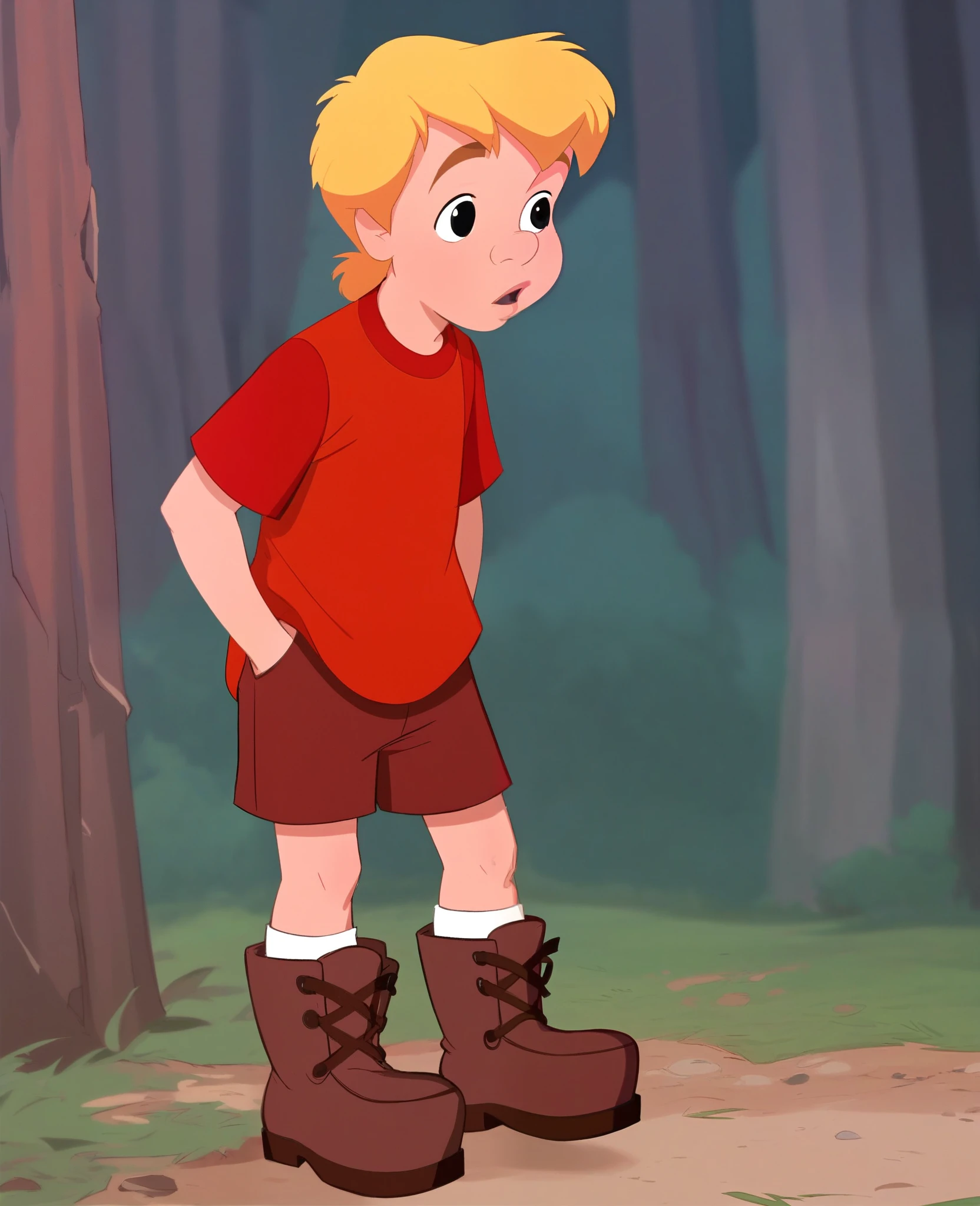 cody, blonde hair, black eyes, red shirt, shorts, boots