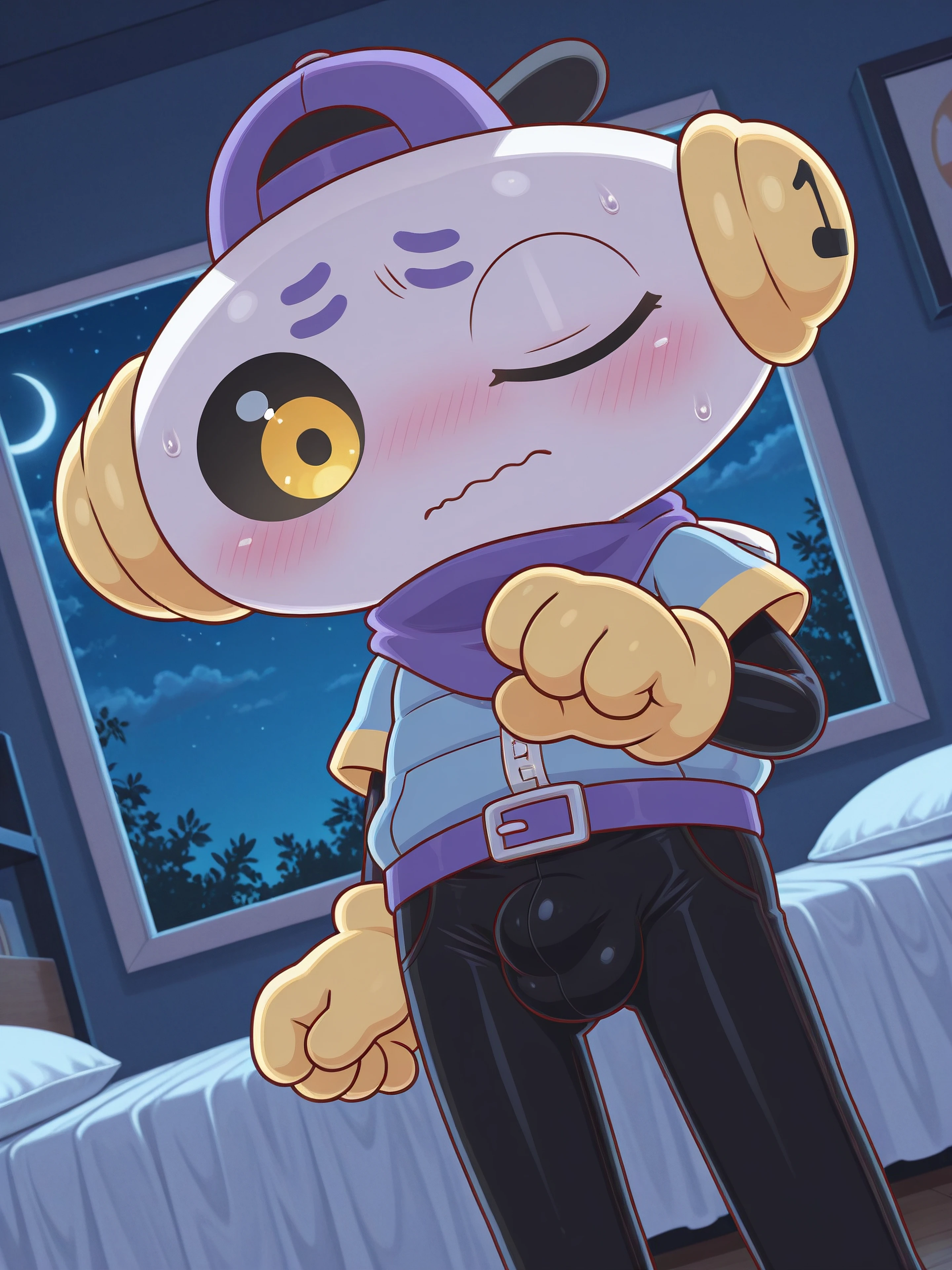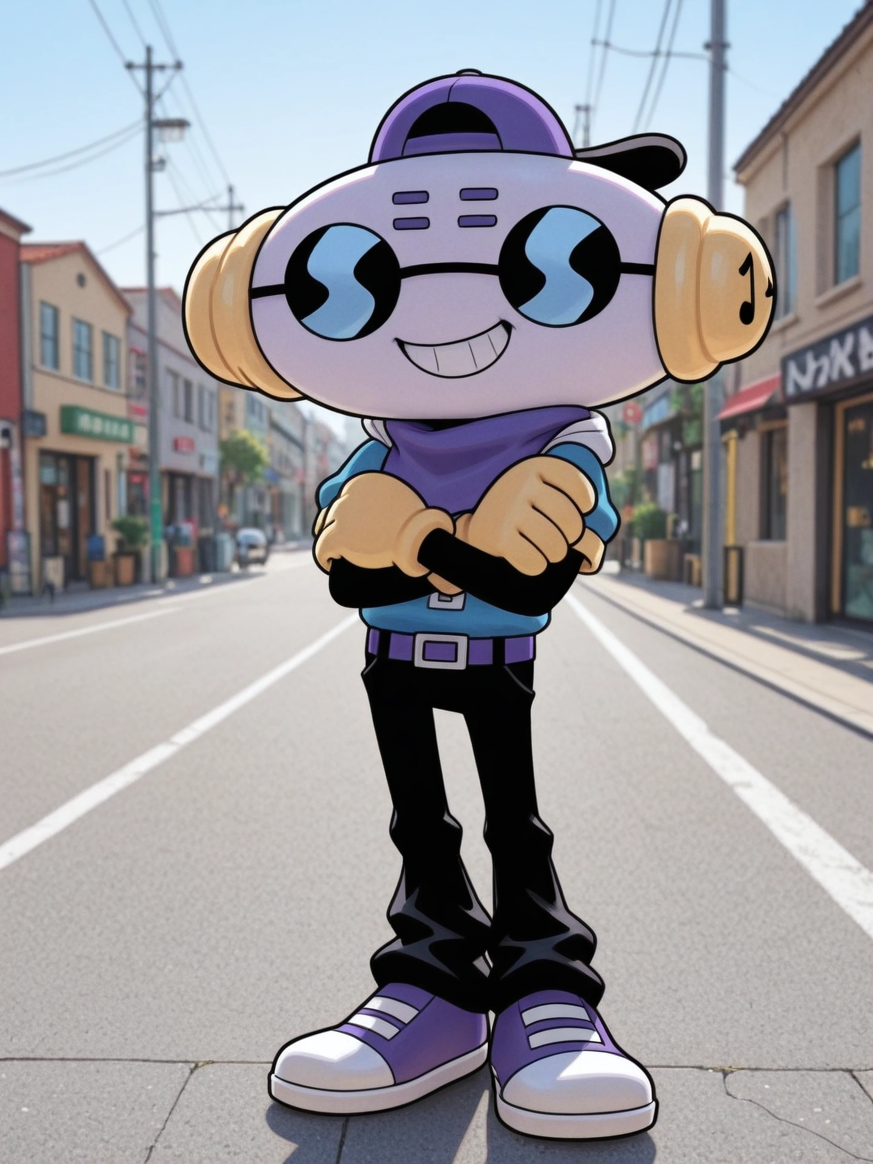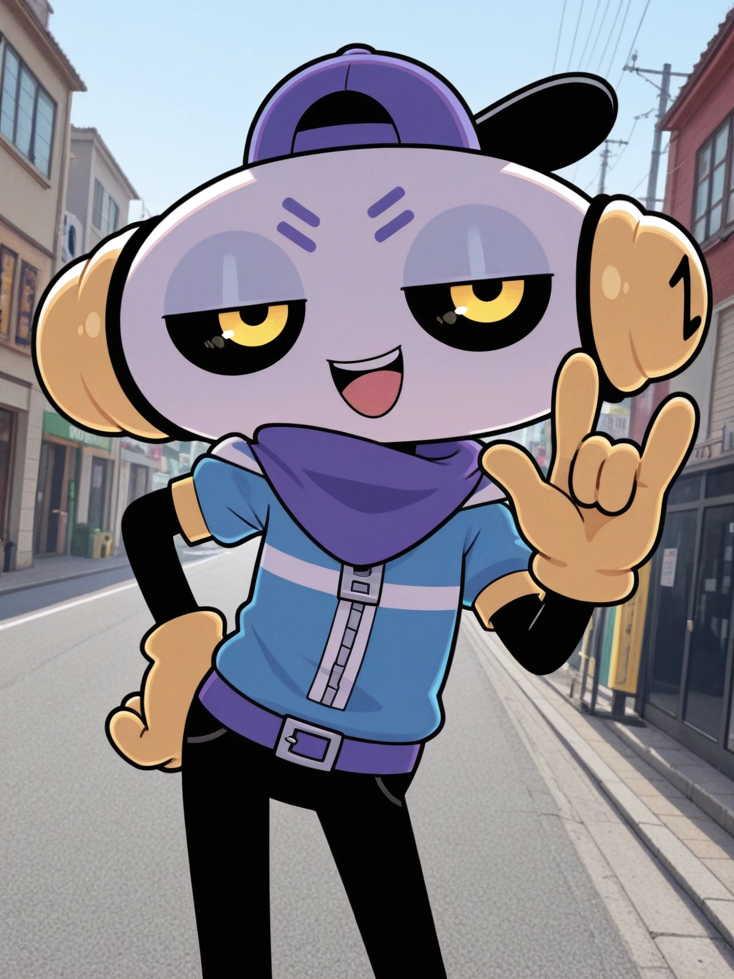 Whenever you want to gen him without his shades on, use "colored sclera" and "yellow eyes" together. "baseball cap" is for his cap, I recommend using "gloves" tag. Particularly good tags also include "\m/", "half closed eyes", "v", and "no humans".