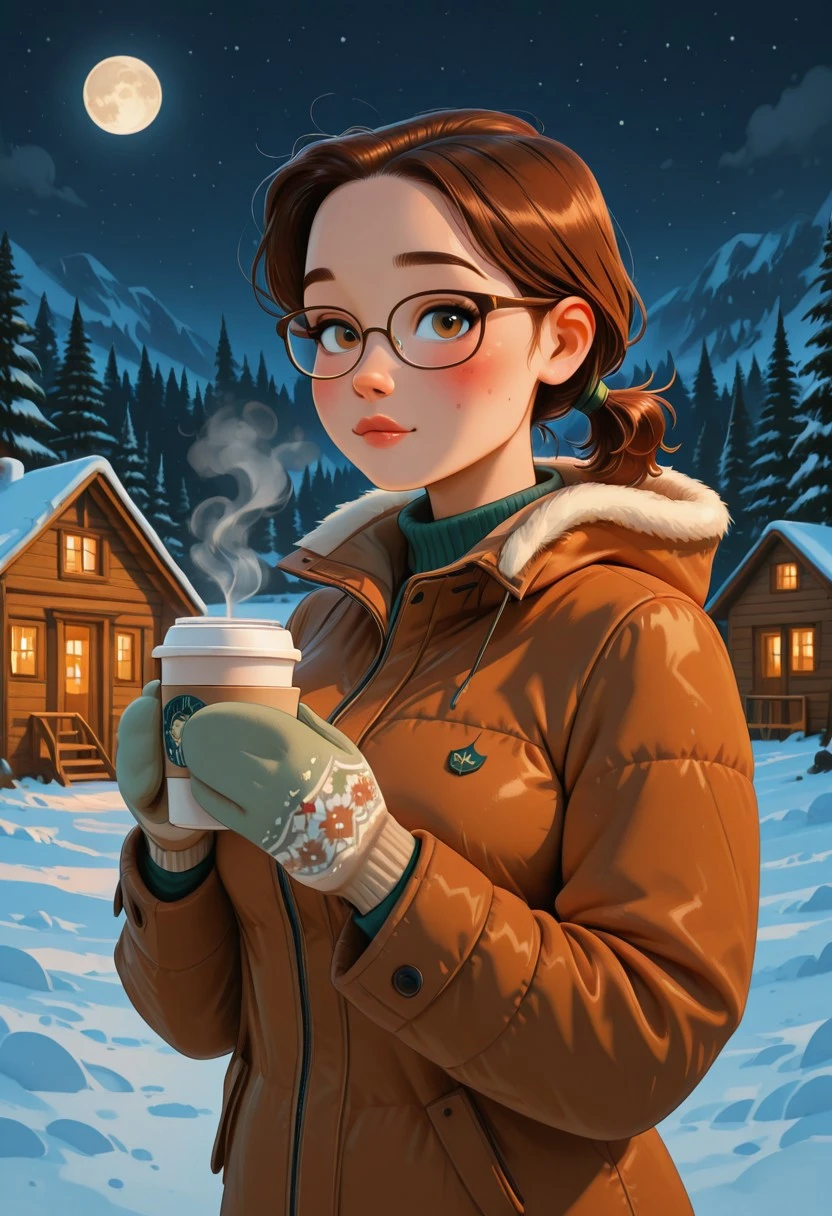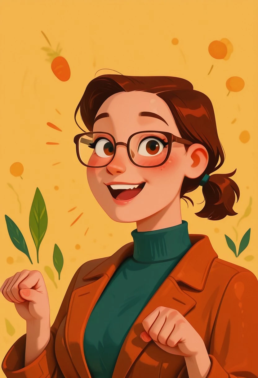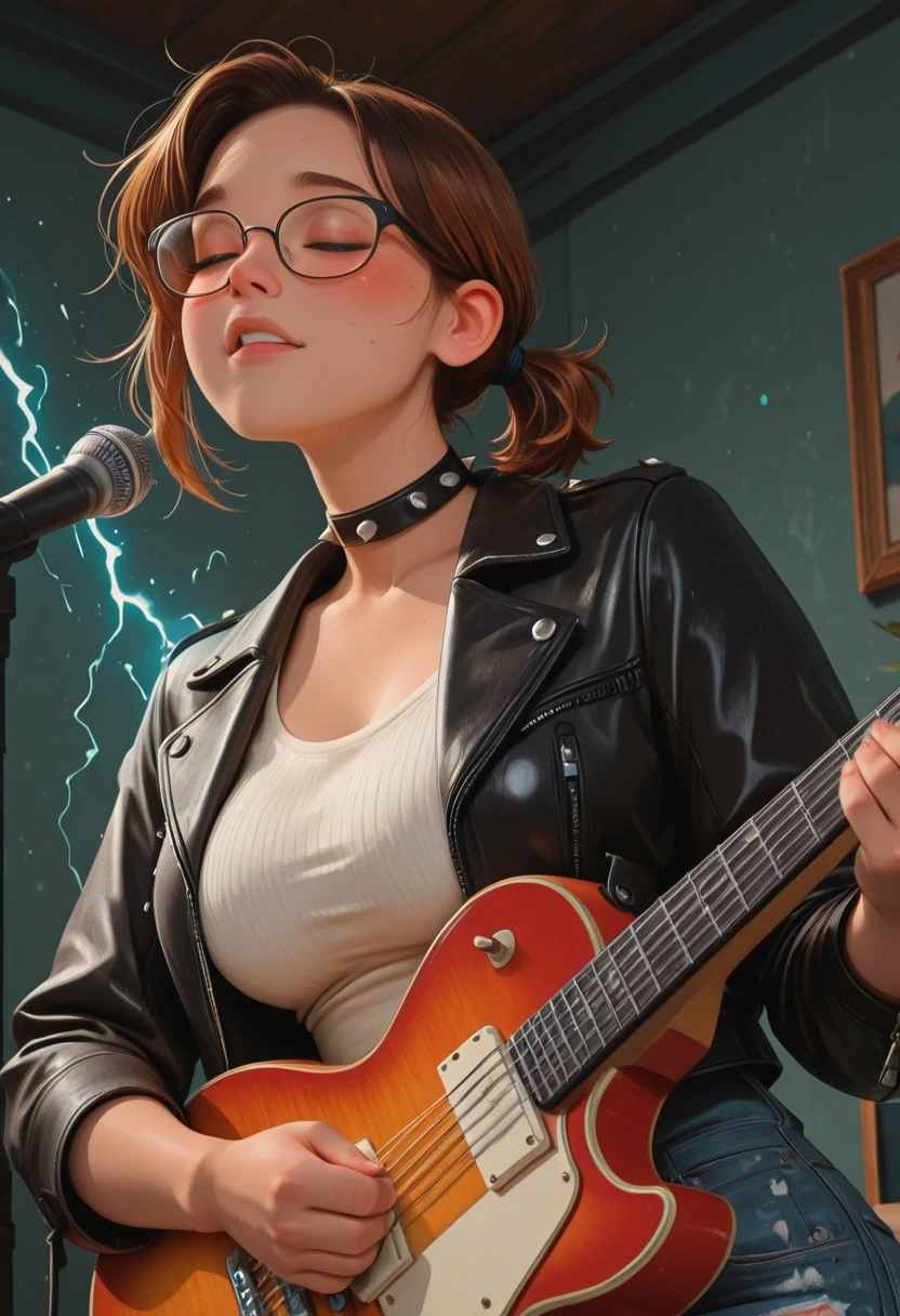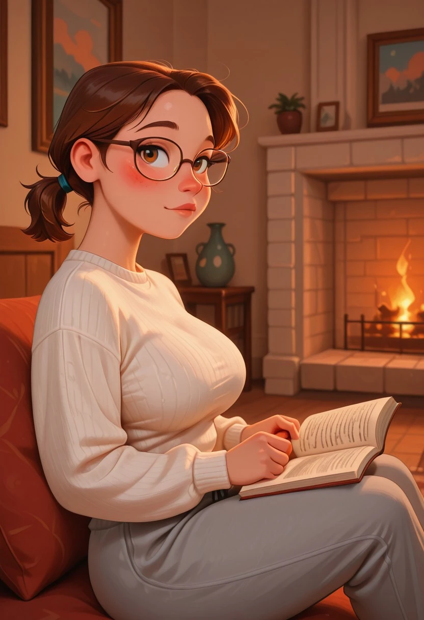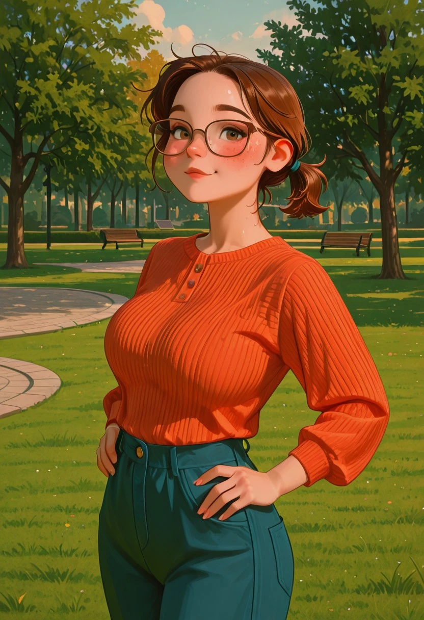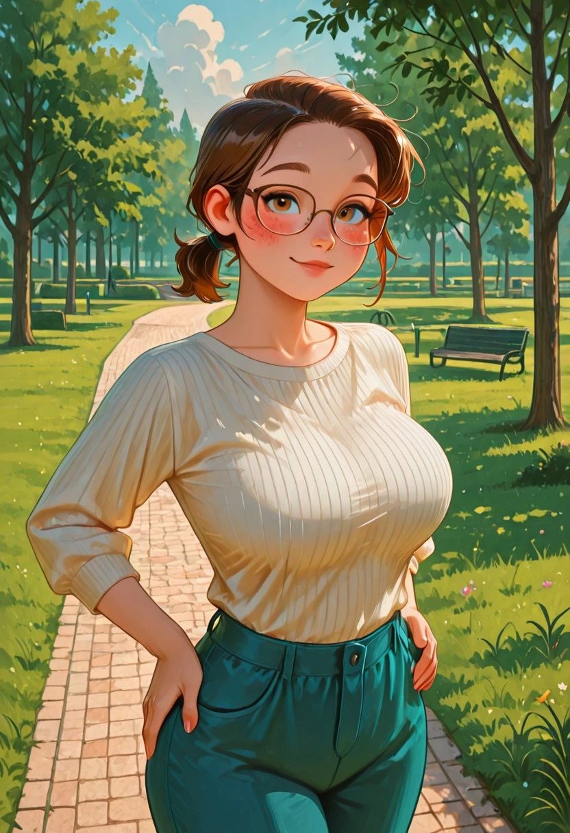 pv_girl_brun3tt3, 1girl, brown hair, short ponytail, large breasts, glasses, rosy cheeks,