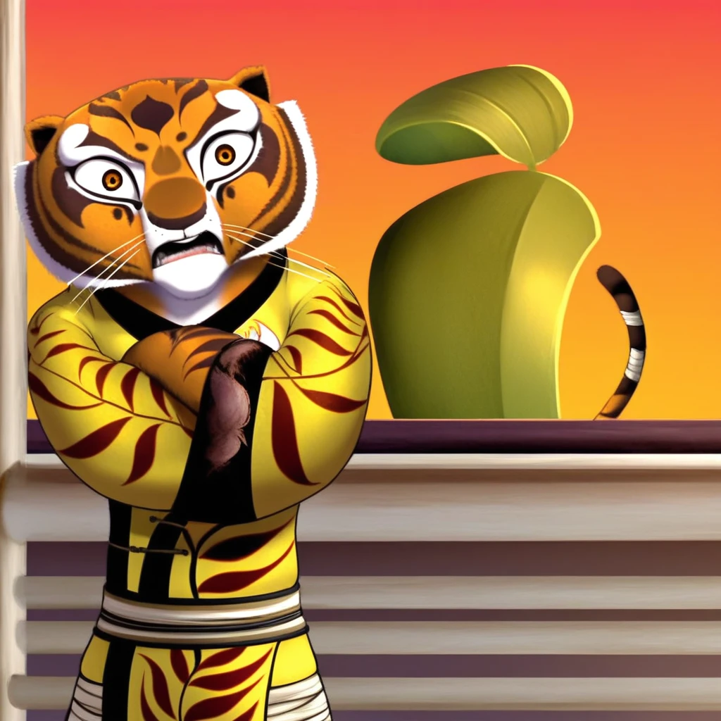 tigress, furry, furry female, tiger, female, orange fur, brown fur design, yellow sclera, red eyes, whiskers, black nose, white fur, 3D, yellow robe, paws,