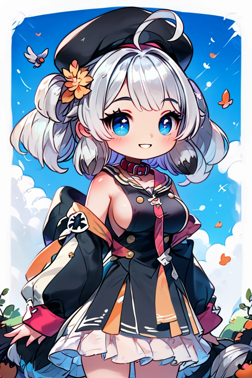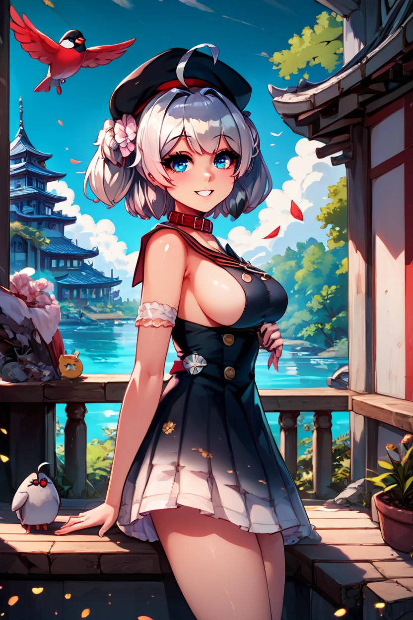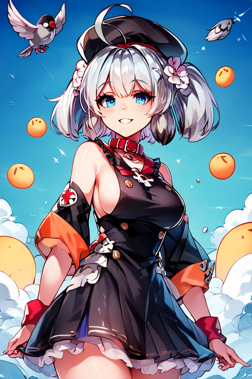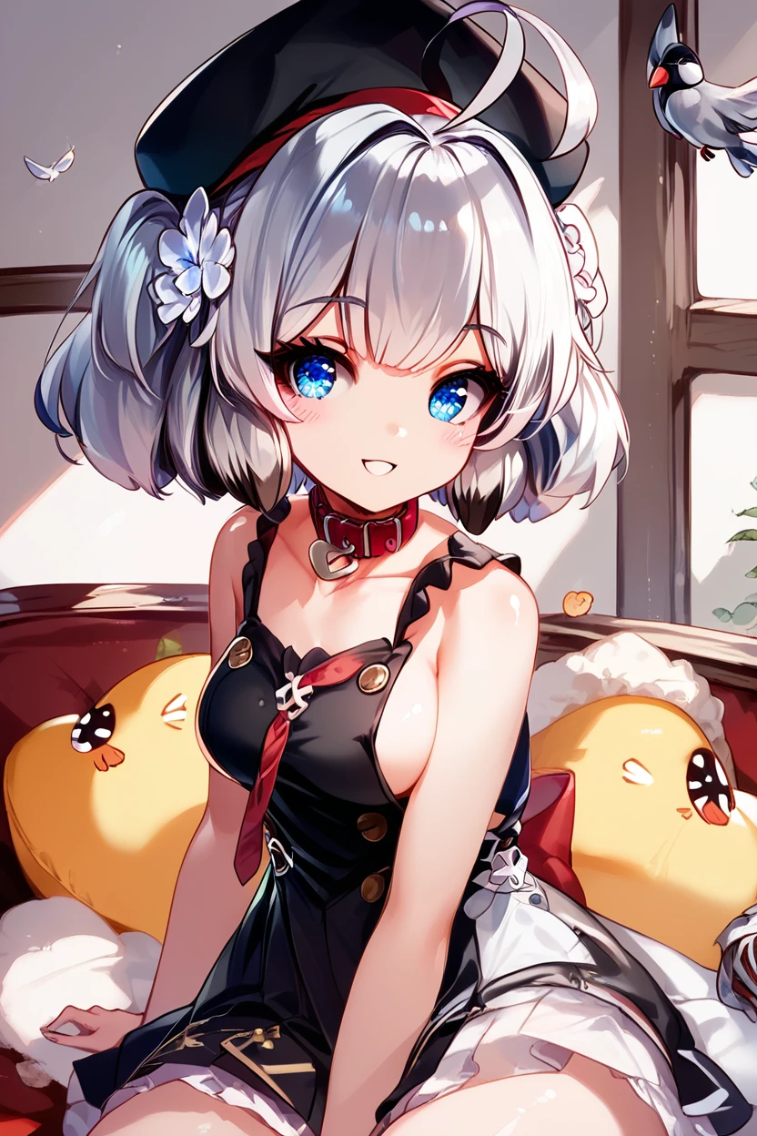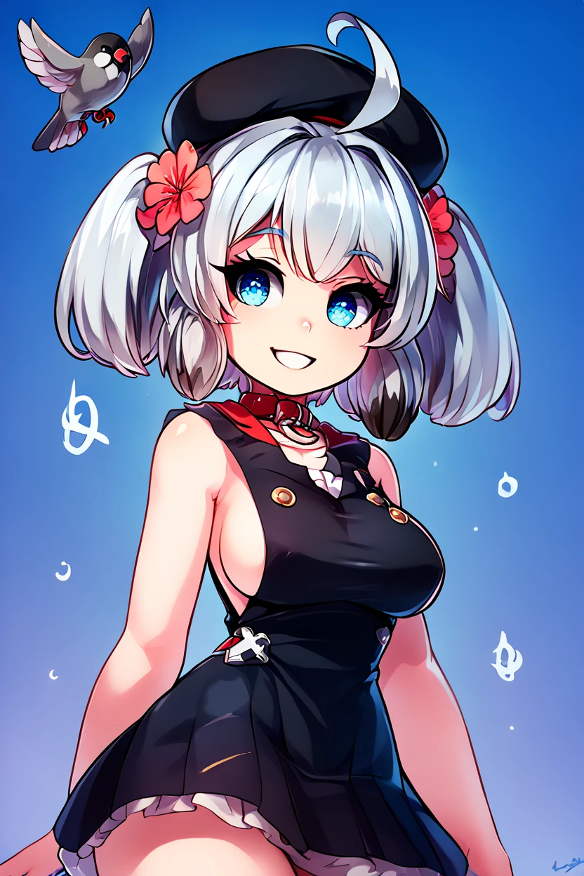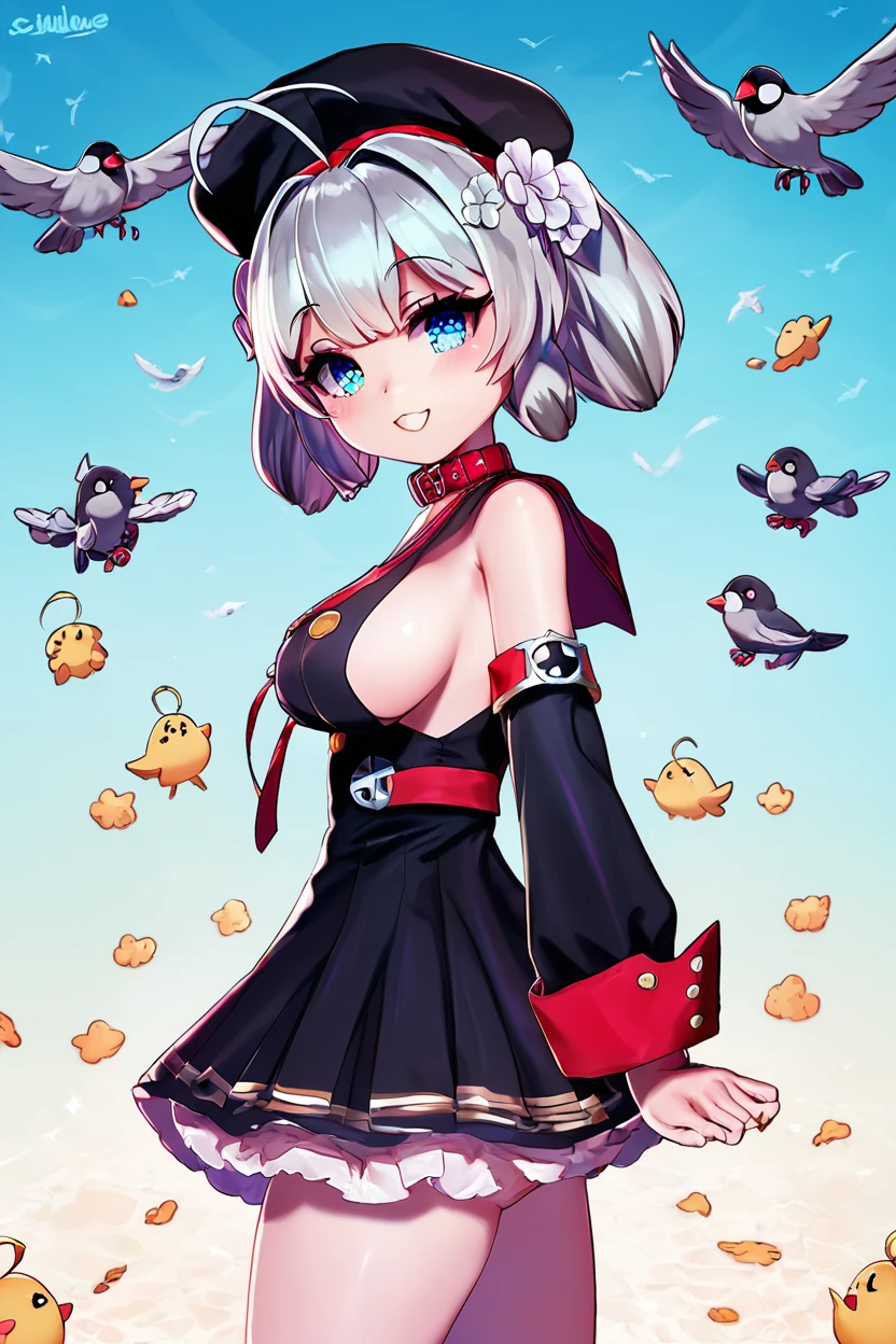 zZ28, blue eyes, ahoge, silver hair, hair flower, hair intakes, hair ornament, hairband, multicolored hair, short hair, two side up, hat, collar, beret, large breasts, black headwear, black dress, side boob,