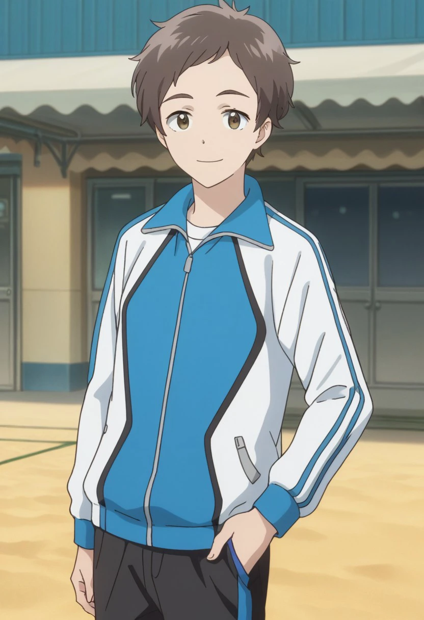 yuuta, 1boy, male focus, jacket, pants, brown hair, brown eyes, track jacket, long sleeves, black pants, short hair, blue jacket, white jacket