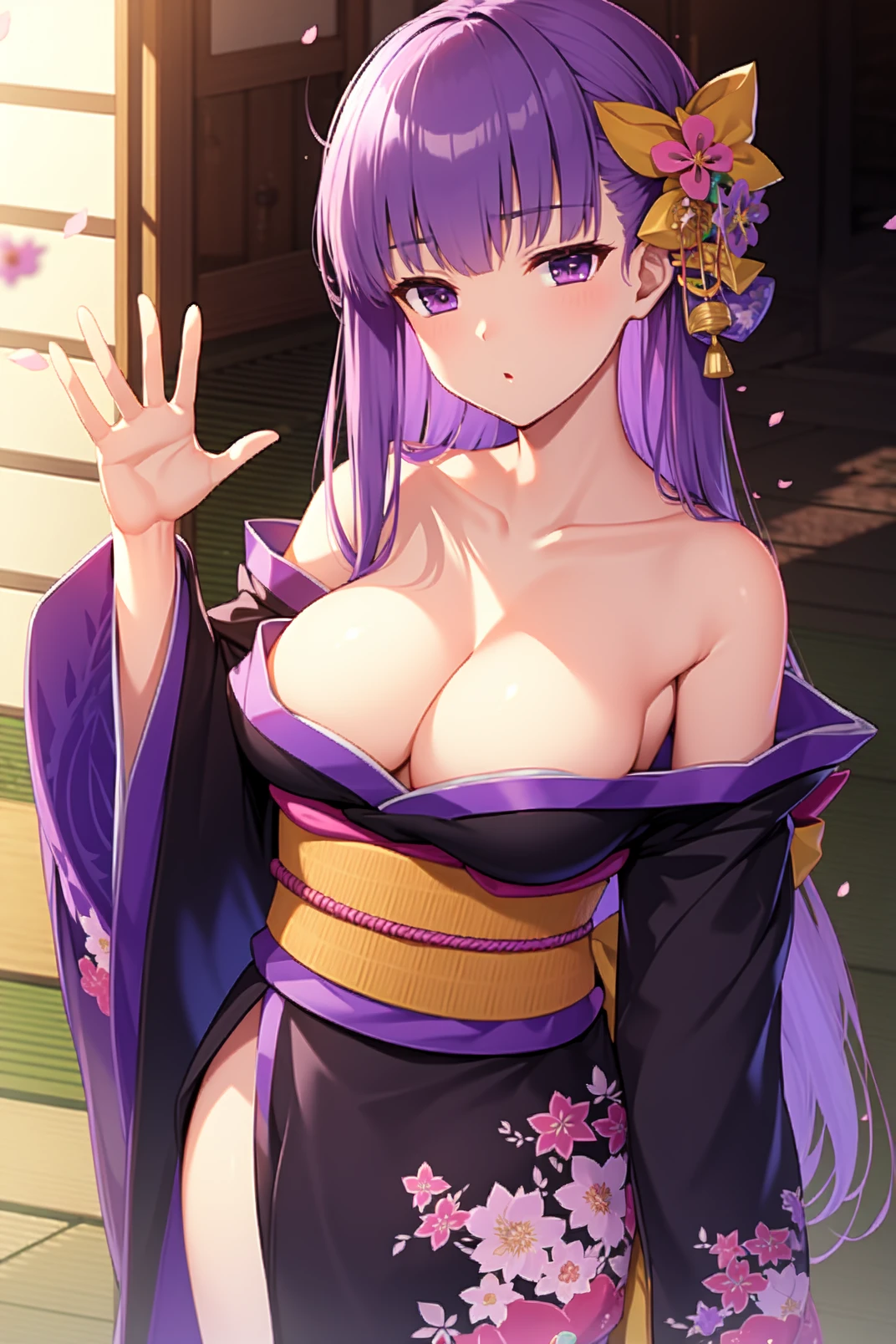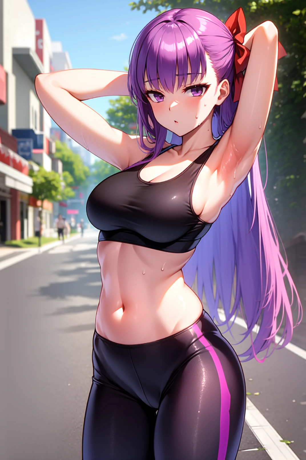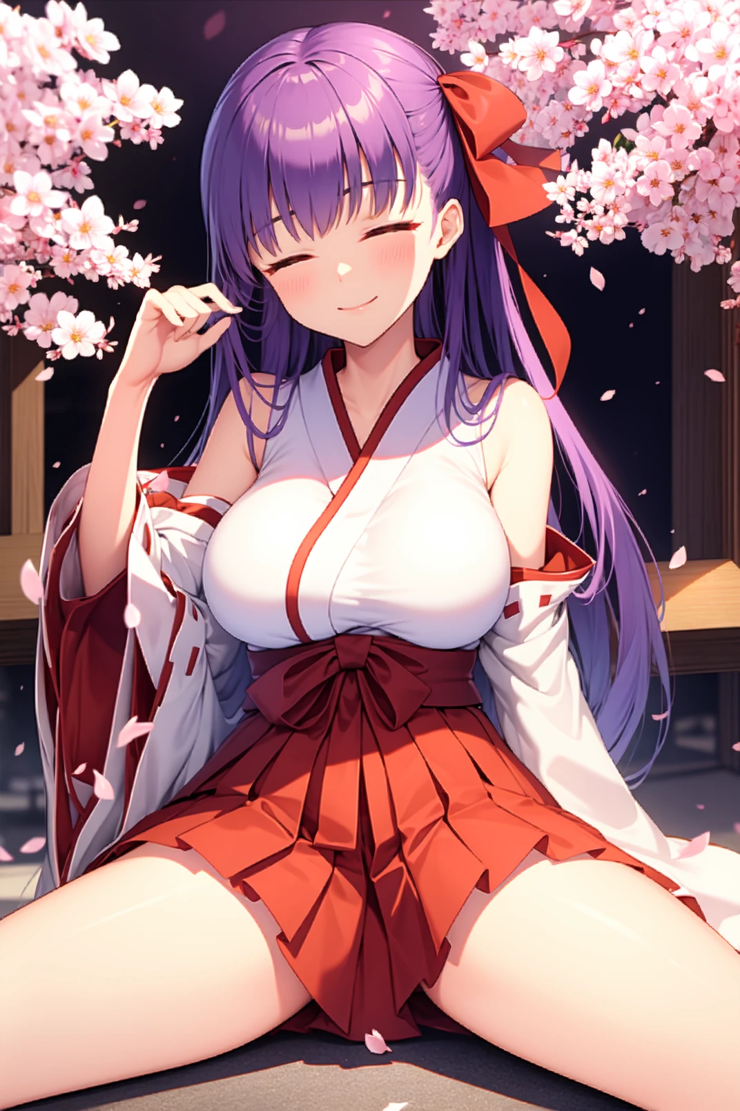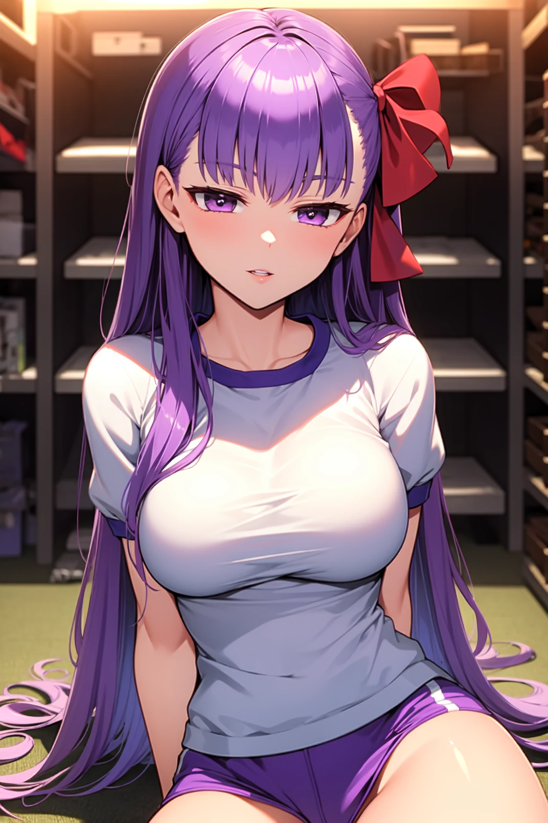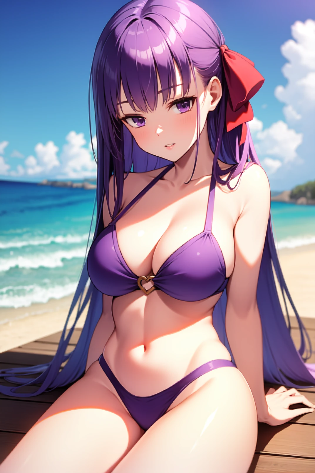 appearance: bb, purple eyes, purple hair, long hair, bangs, red hair bow