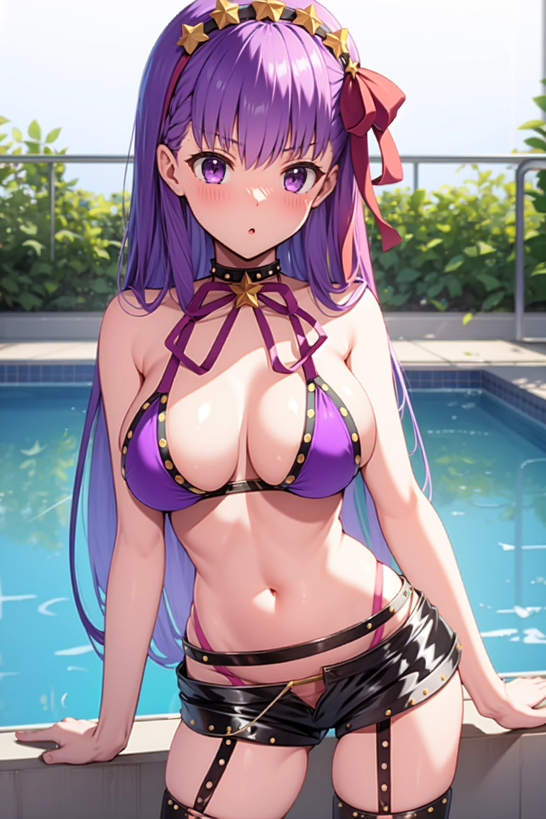 bb, purple eyes, purple hair, long hair, bangs, red hair bow