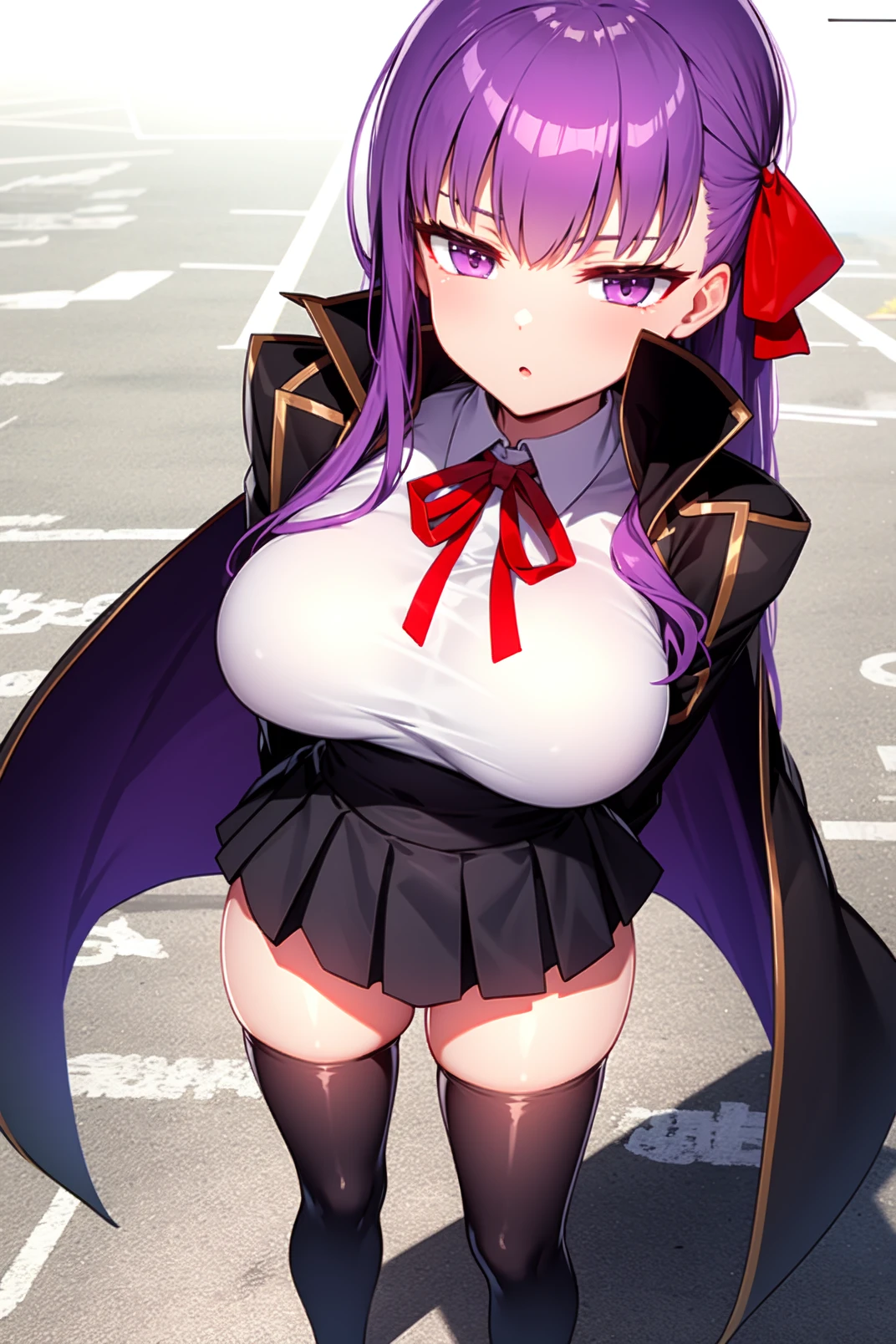 outfit: black cape, long sleeves, collared shirt, red ribbon, white gloves, waist skirt, black skirt, pleated skirt, black thighhighs