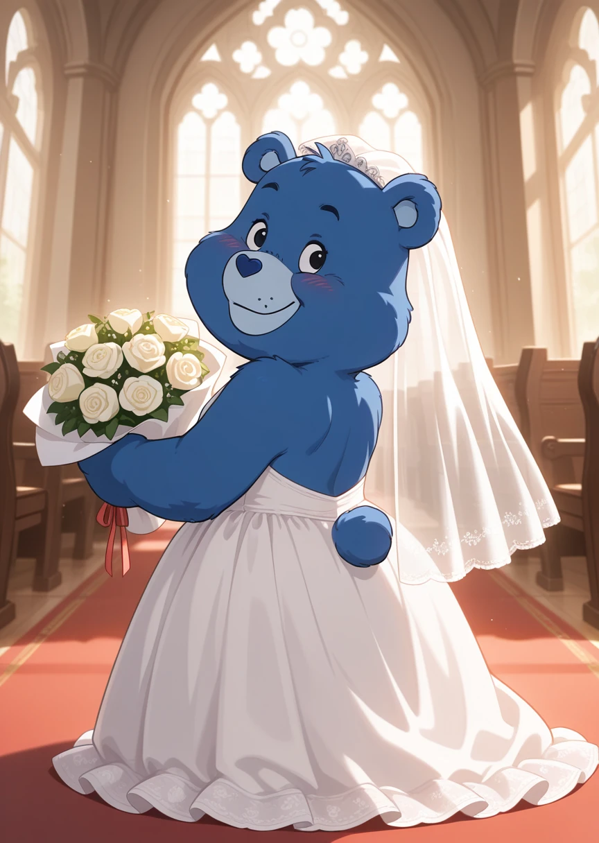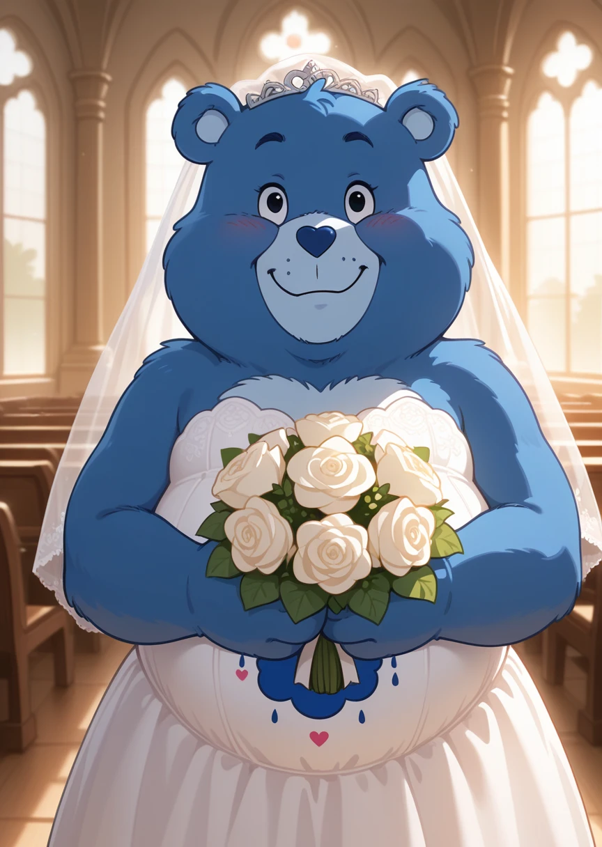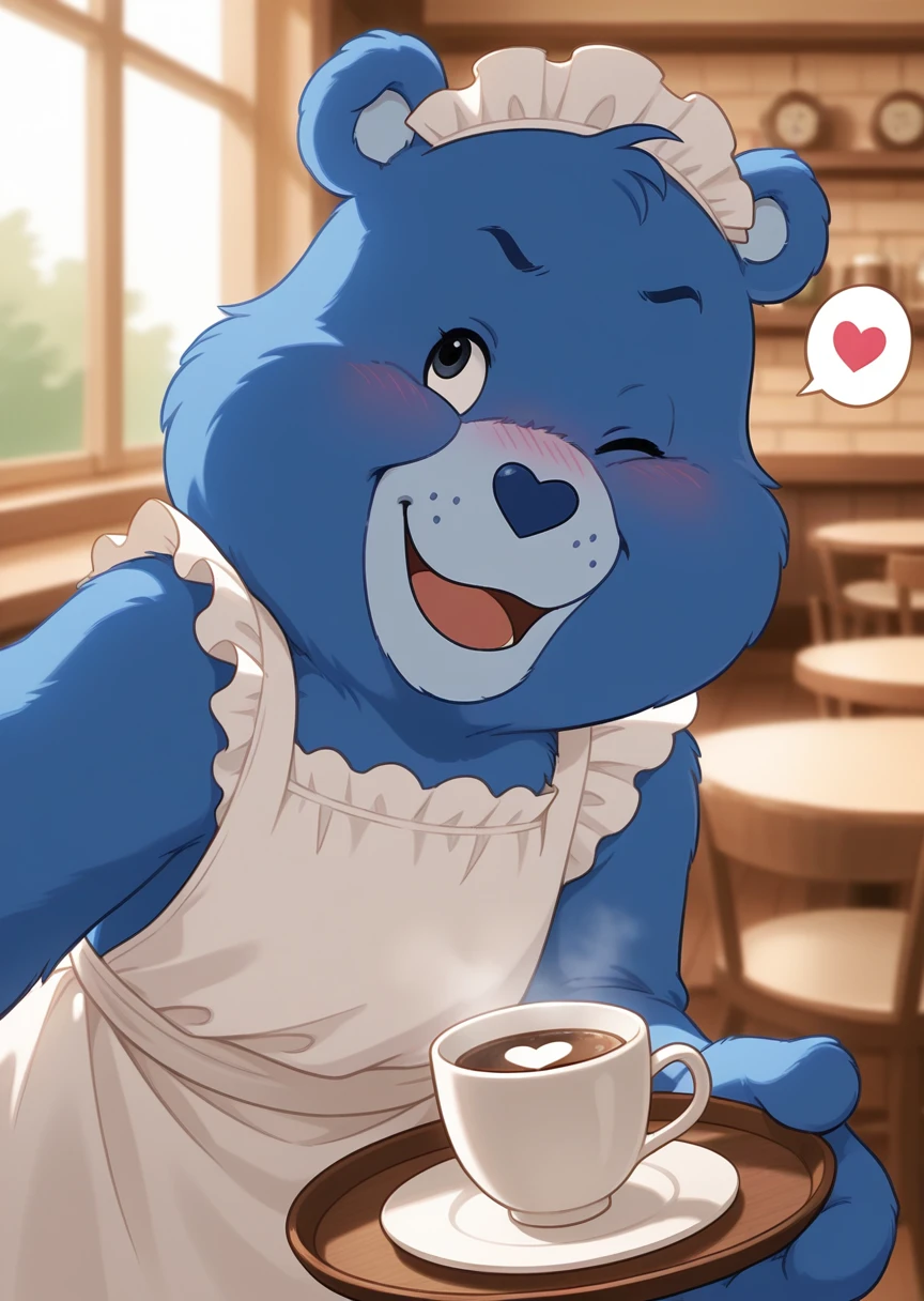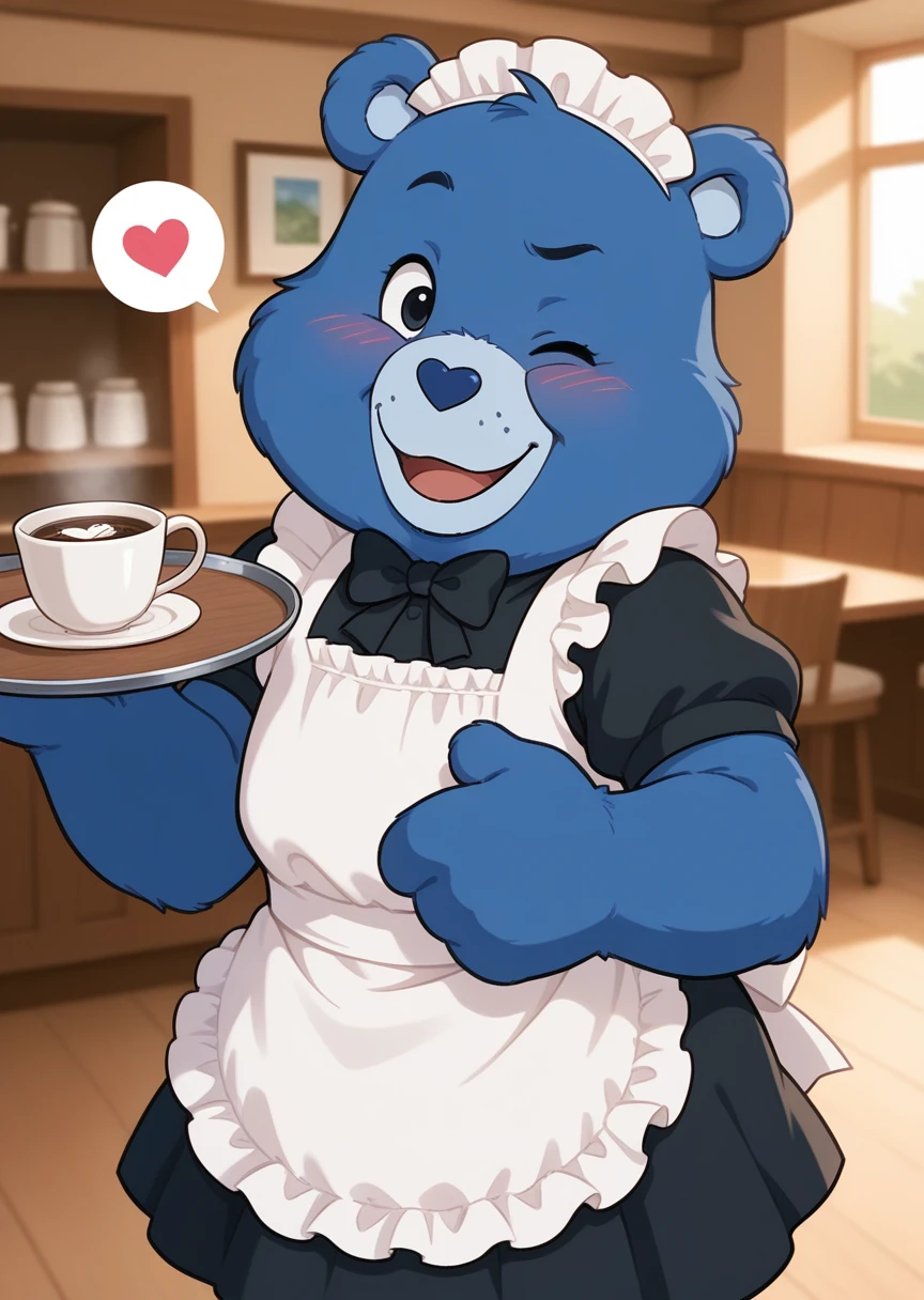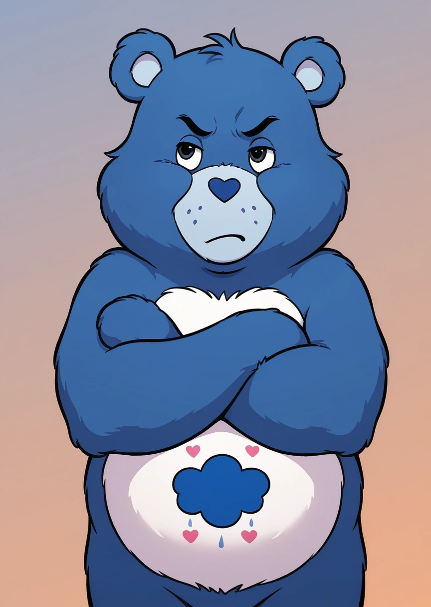grumpy bear, animal ears, blue fur, black eyes, belly markings, furry,